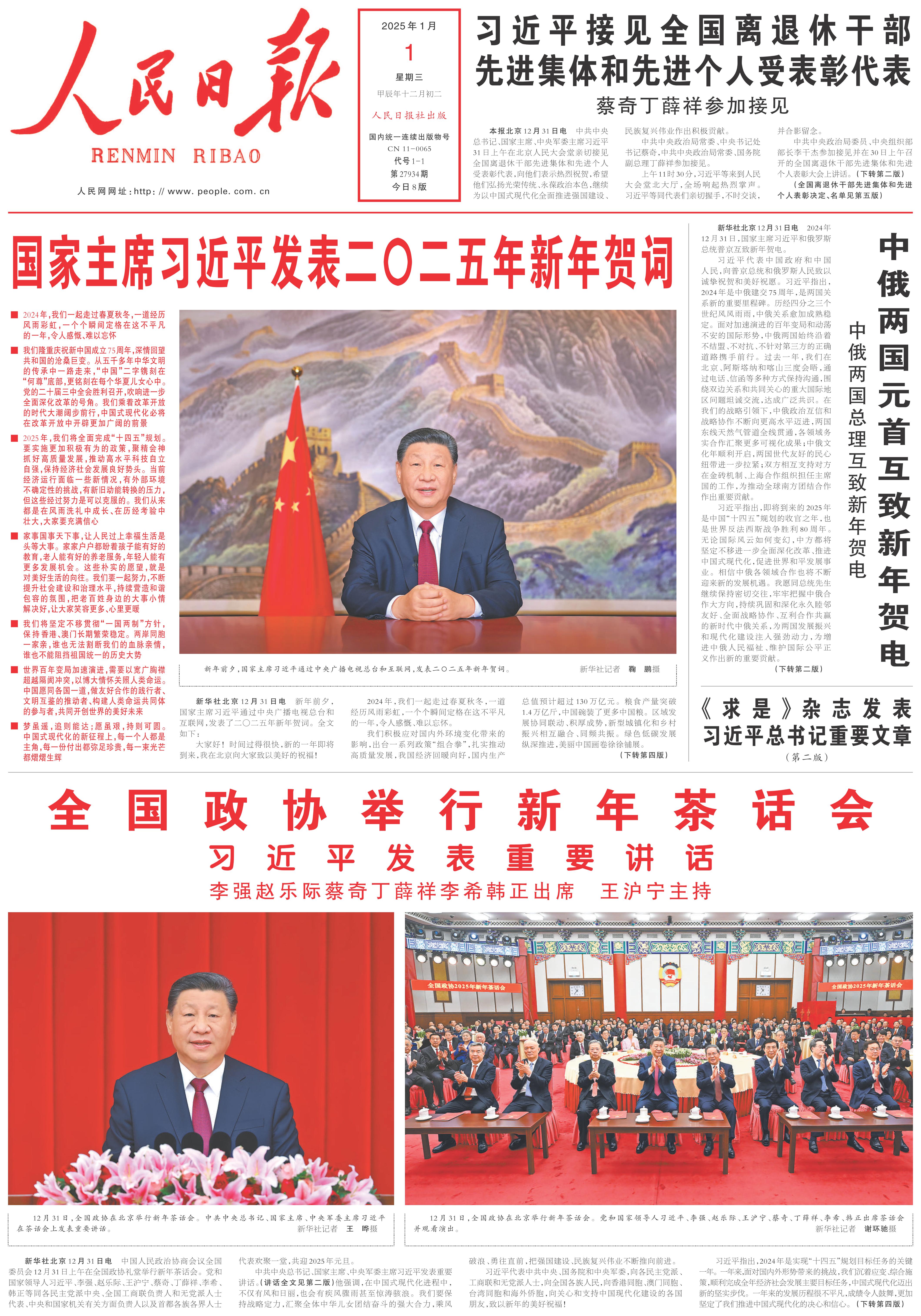 2015年元旦《人民日報》發表《國家主席習近平發表二〇一五年新年賀詞》。