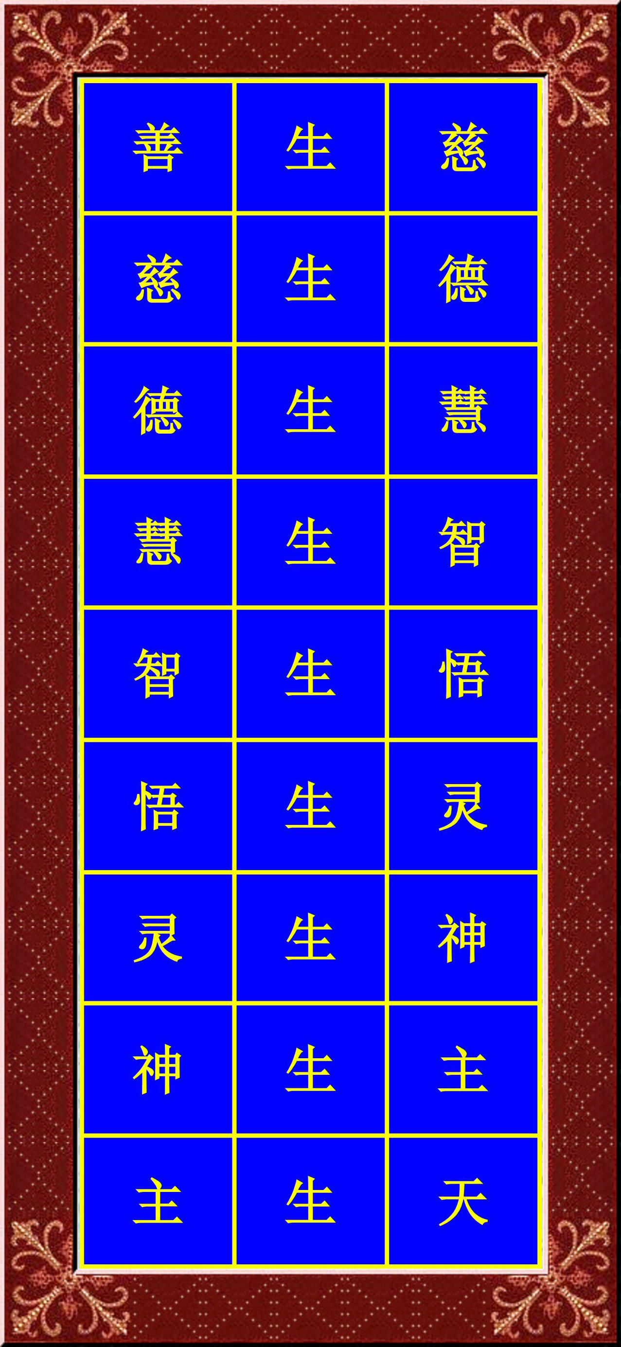 善生慈 慈生德 德生慧 慧生智 智生悟 悟生靈 靈生神 神生主 主生天