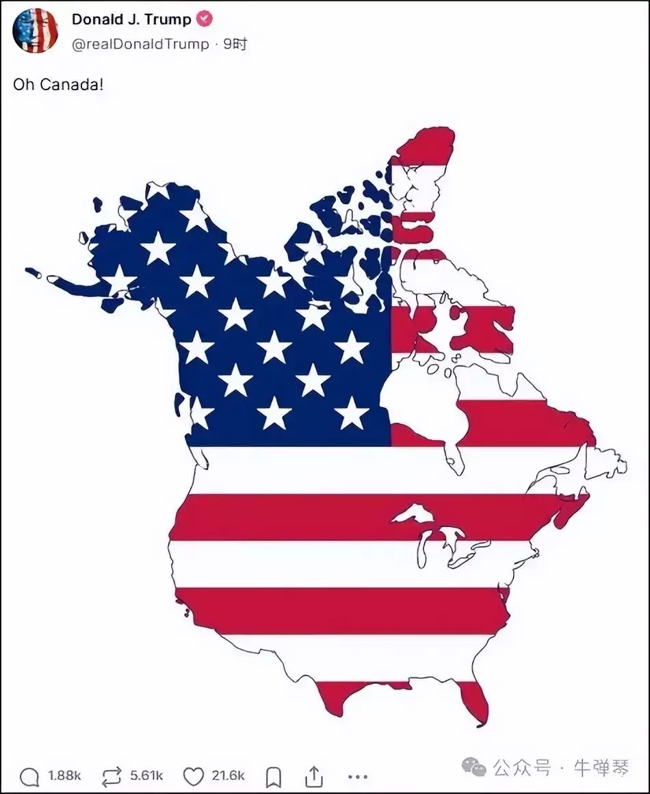 一張圖,美加所有土地,都是美國星條旗圖案,特朗普配文:“哦,加拿大!”