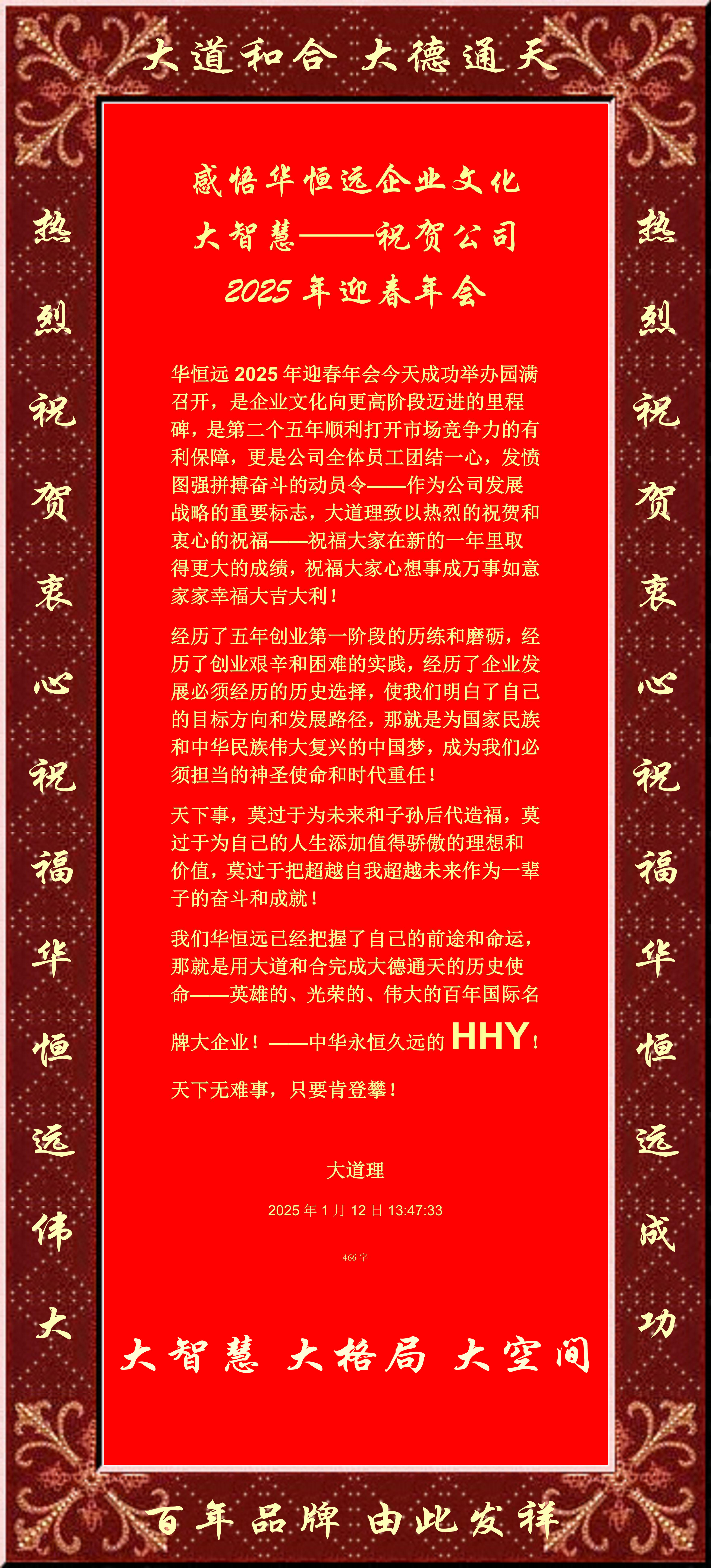 我們華恒遠已經把握了自己的前途和命運,那就是用大道和合完成大德通天的歷史使命——英雄的、光榮的、偉大的百年國際名牌大企業!——中華永恒久遠的HHY!