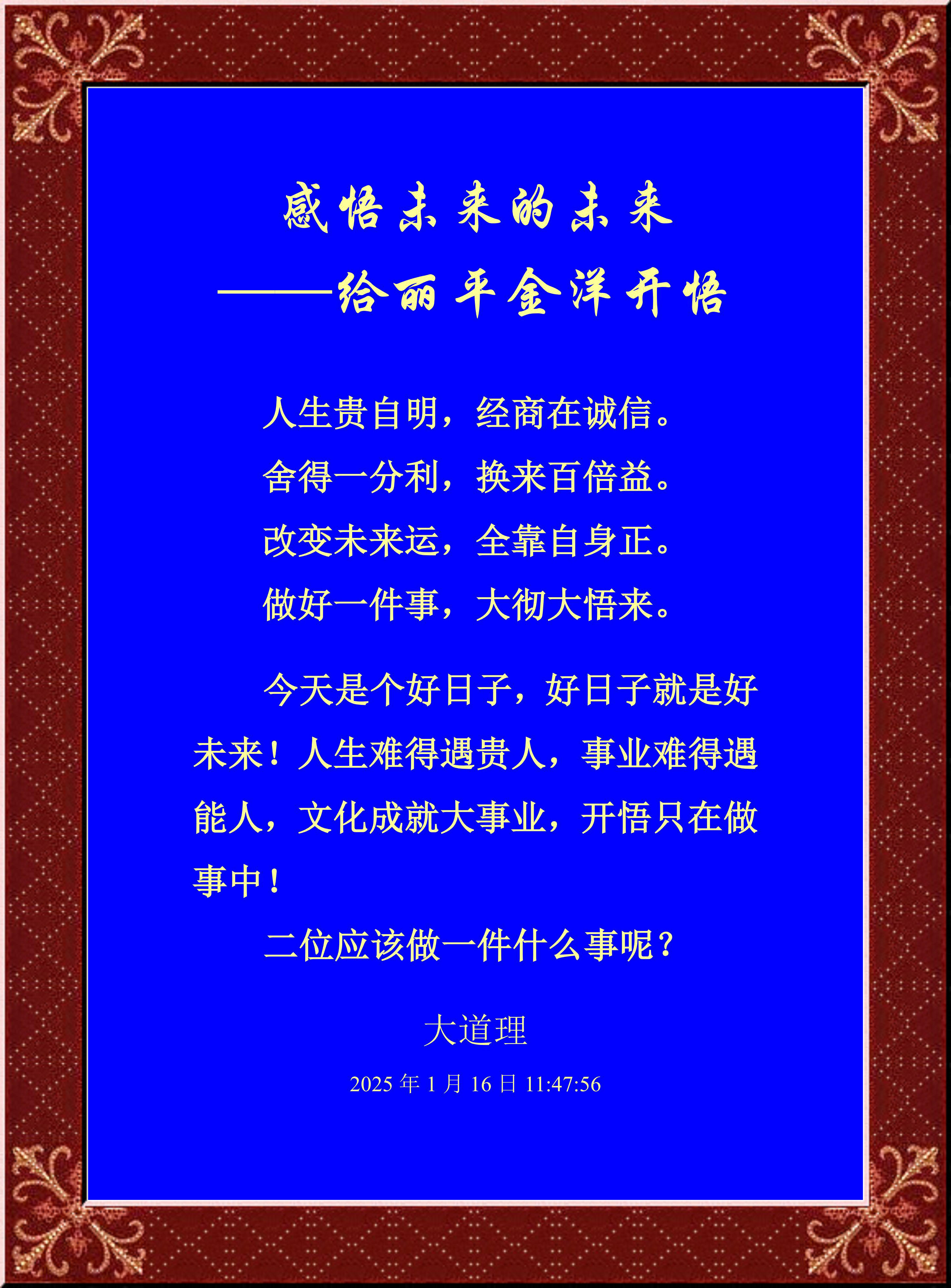 今天是個好日子,好日子就是好未來!人生難得遇貴人,事業(yè)難得遇能人,文化成就大事業(yè),開悟只在做事中!