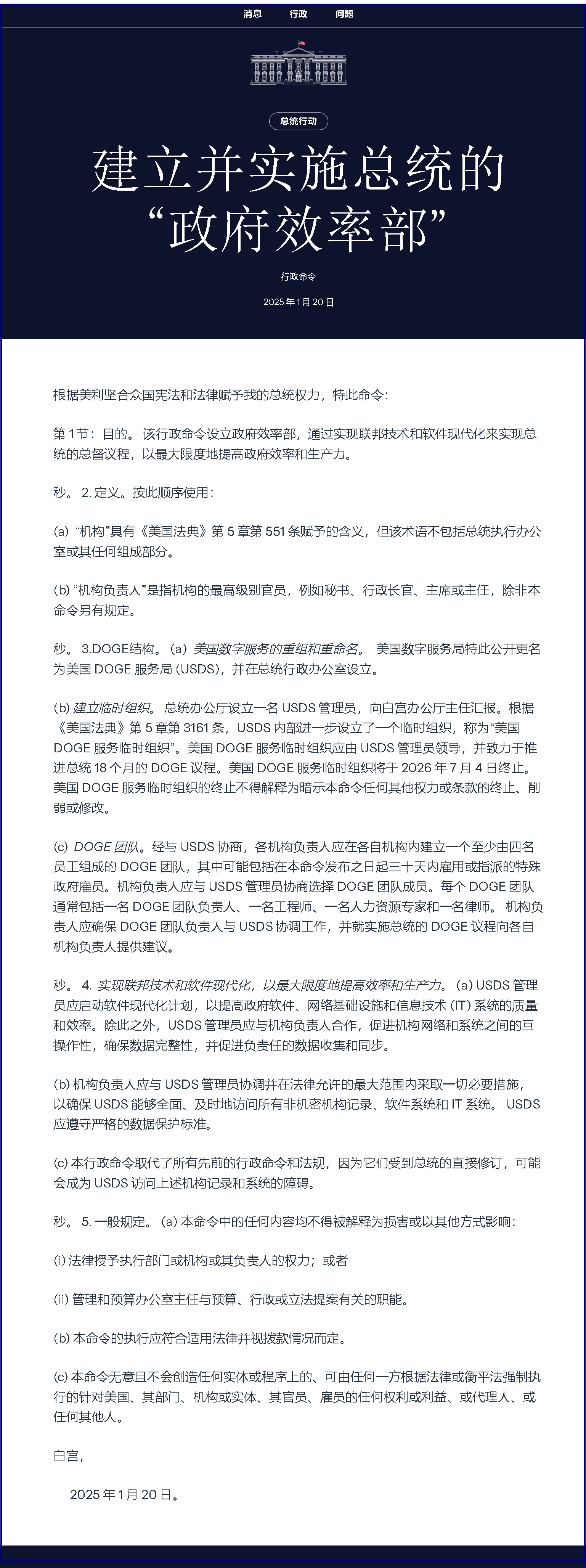 秒。 3.DOGE結構。 (a) 美國數字服務的重組和重命名。 美國數字服務局特此公開更名為美國 DOGE 服務局 (USDS),并在總統行政辦公室設立。