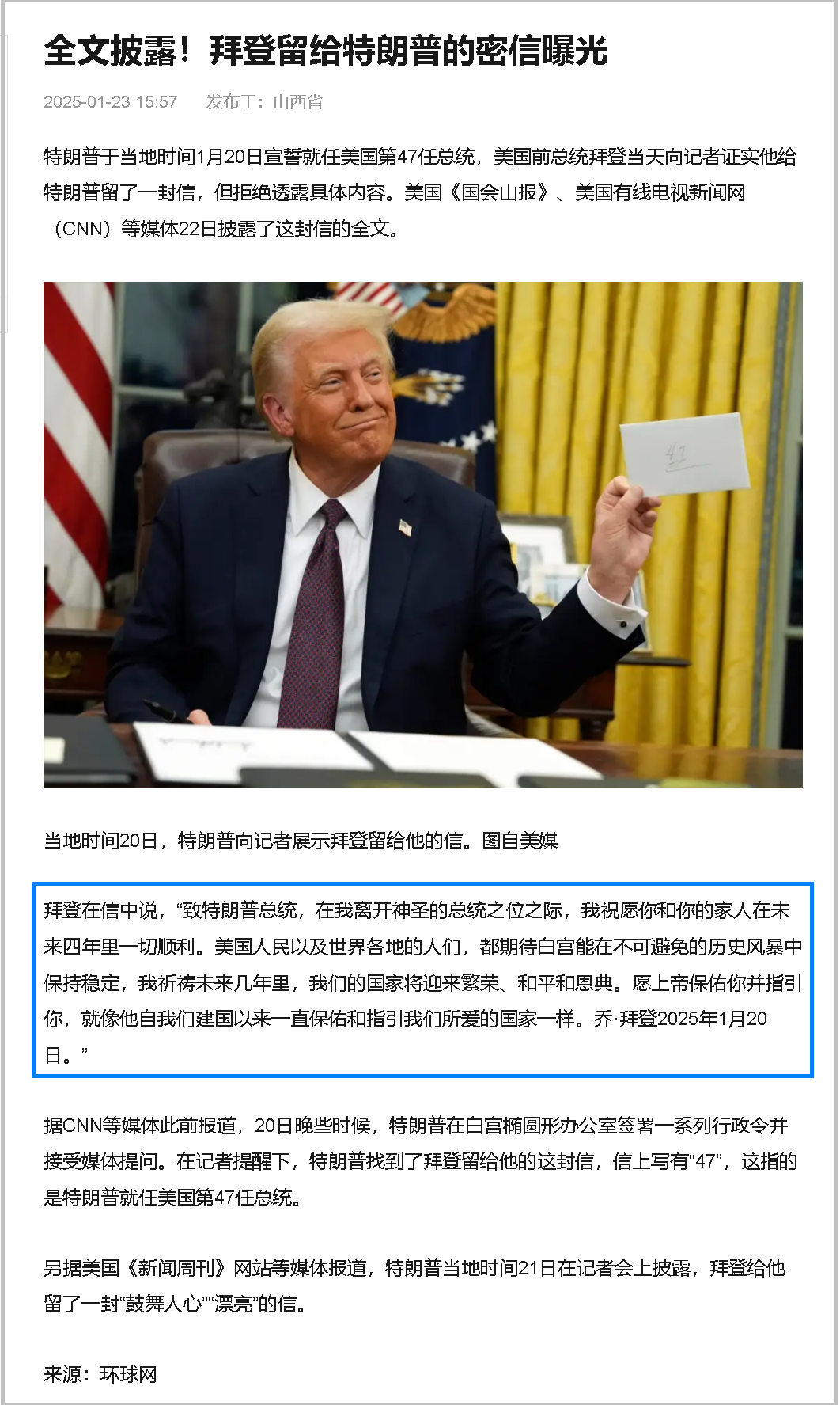 致特朗普總統,在我離開神圣的總統之位之際,我祝愿你和你的家人在未來四年里一切順利。美國人民以及世界各地的人們,都期待白宮能在不可避免的歷史風暴中保持穩定,我祈禱未來幾年里,我們的國家將迎來繁榮、和平和恩典。愿上帝保佑你并指引你,就像他自我們建國以來一直保佑和指引我們所愛的國家一樣。喬·拜登2025年1月20日。