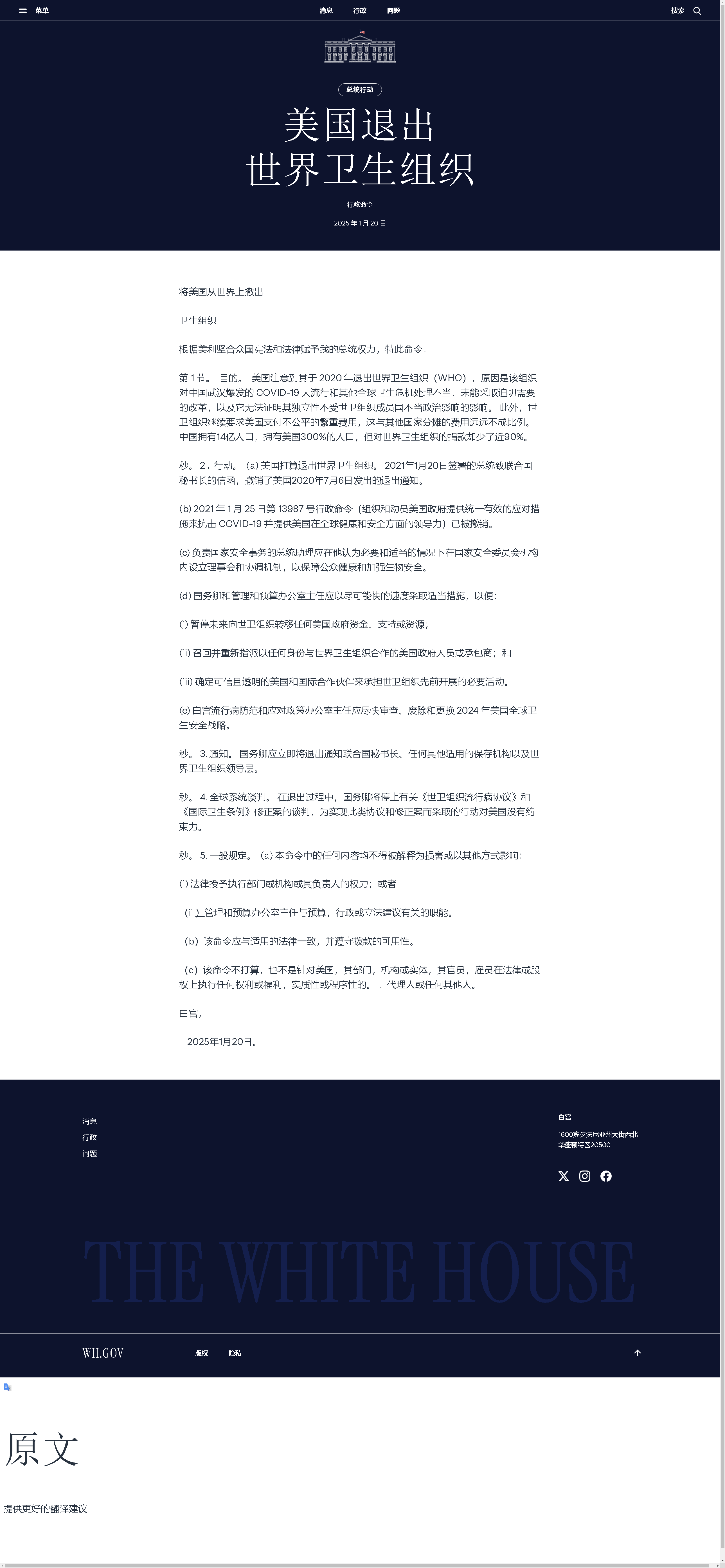 白宮發(fā)布的行政令稱,美國國務(wù)卿應(yīng)將美國這一決定立即通知聯(lián)合國秘書長和世衛(wèi)組織領(lǐng)導(dǎo)層。行政令還要求盡快采取適當措施,暫停向世衛(wèi)組織提供任何來自美國政府的資金、支持和資源。