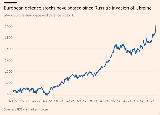 《金融時報》指出,歐盟各國的官方數據顯示,從俄烏沖突爆發前的2021年到爆發后的2024年,其國防總開支增長超過30%,預計總金額達3260億歐元,約占成員國GDP的1.9%。隨之共同飆升的還有歐洲各大軍火商的股價。報道說,自2022年2月以來,萊茵金屬的股價已上漲近三倍。