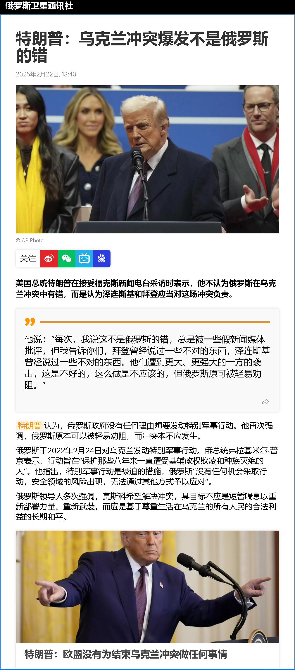 特朗普當(dāng)天在接受美國媒體采訪時說,他觀察澤連斯基“多年了”,“我看到他(澤連斯基)在談判過程中沒牌可出,他沒有牌。”