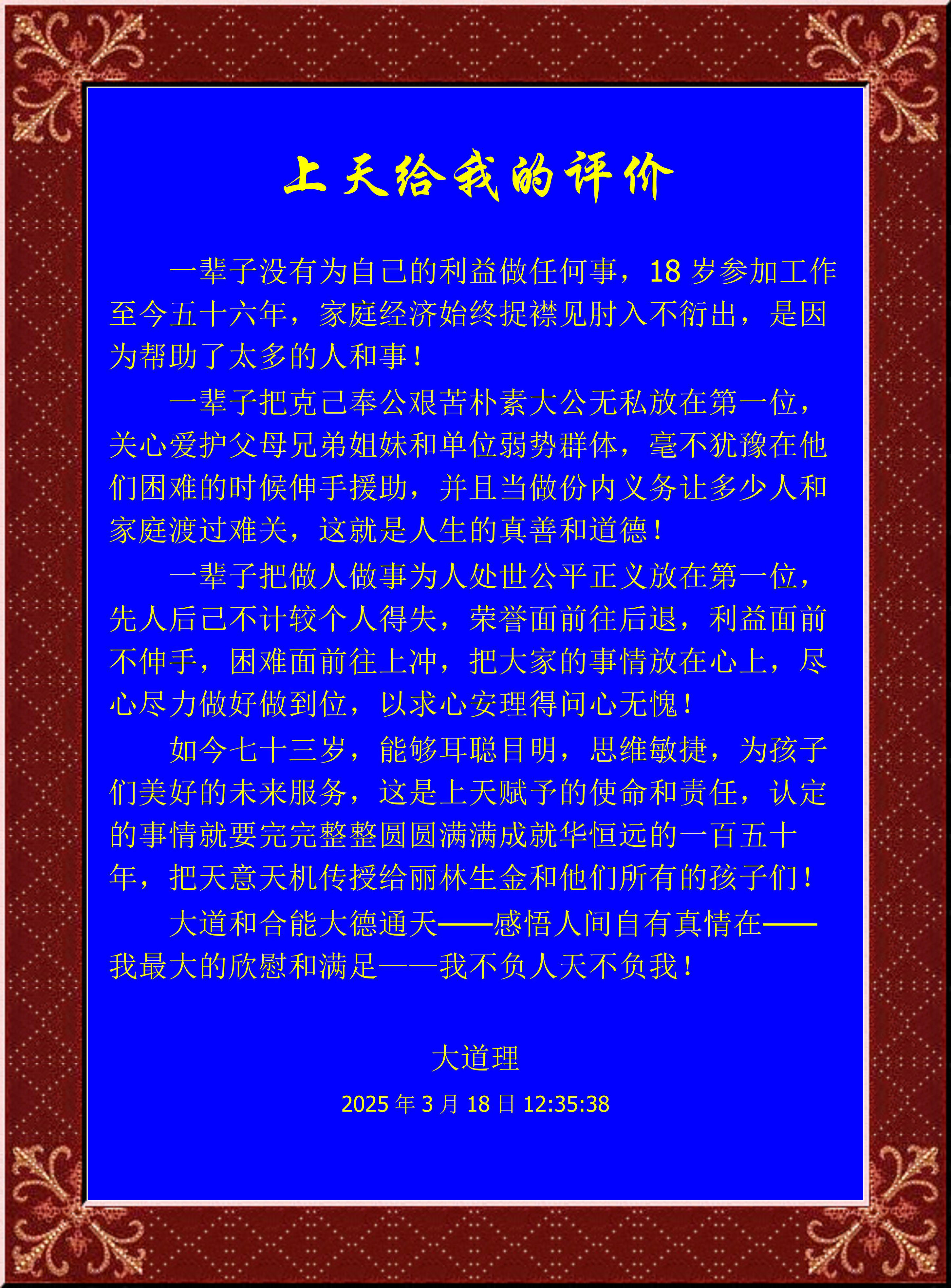 大道和合能大德通天——感悟人間自有真情在——我最大的欣慰和滿足——我不負人天不負我!