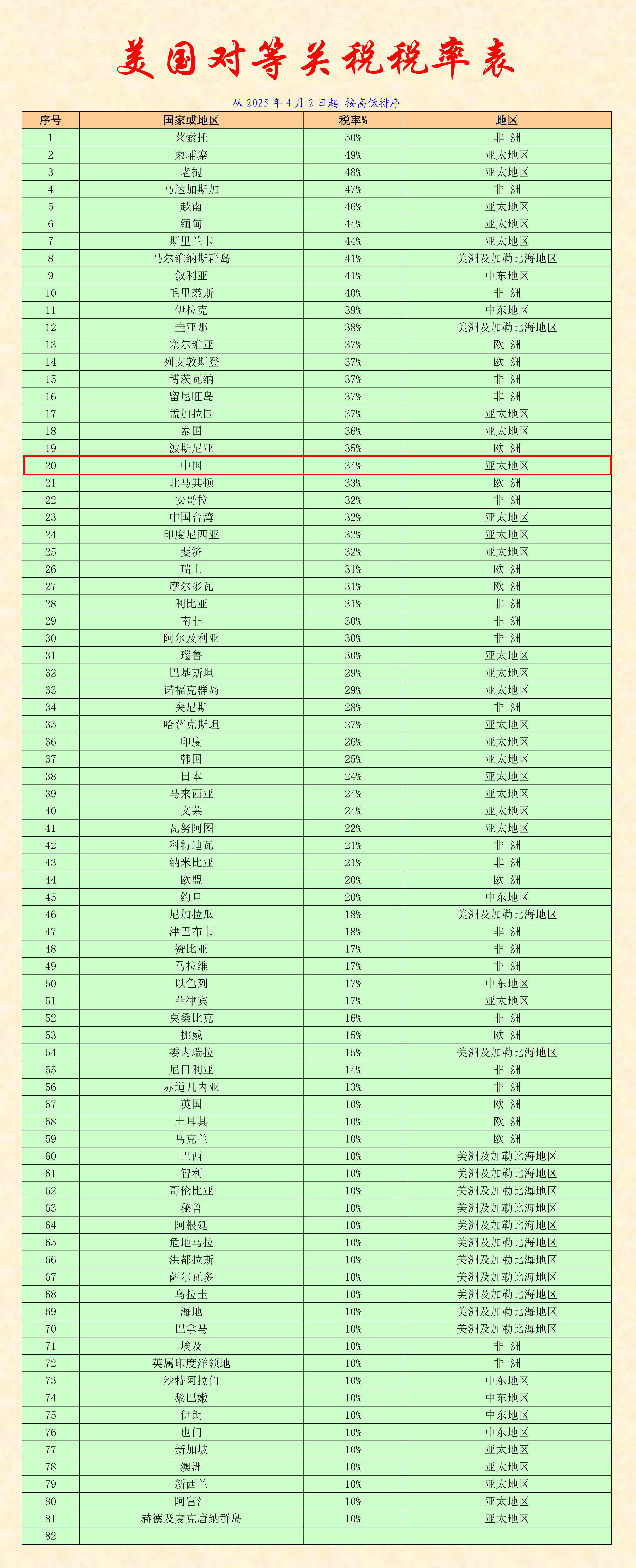 特朗普當日下午在白宮玫瑰園舉行「讓美國再次富裕」活動,將當天形容為美國的「解放日」。按照行政命令,美國對所有進口美國商品加征10%的基準關稅,預計美東時間周六凌晨生效。至于針對部分國家征收的較高額關稅稅率,則于下周二凌晨生效。