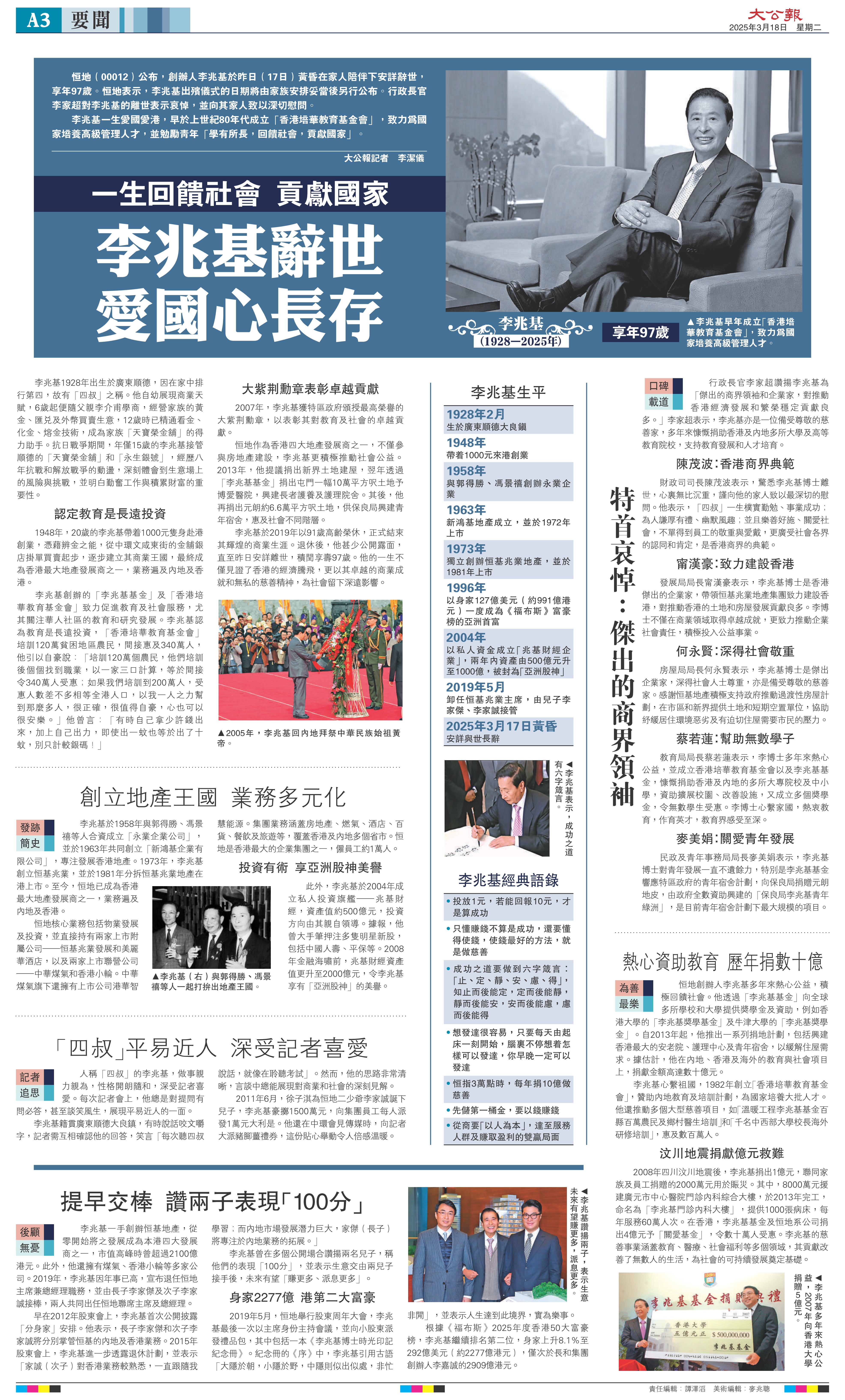 卸任恒基兆業主席,由兒子李家傑、李家誠接管