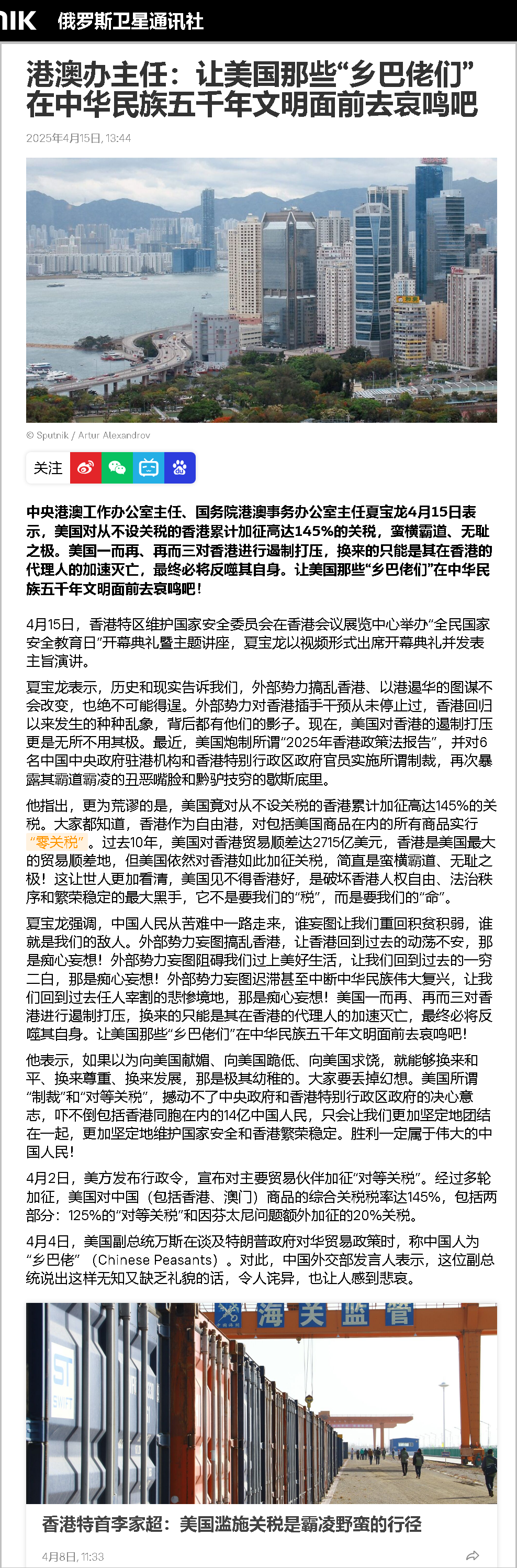 ——?dú)v史和現(xiàn)實(shí)告訴我們,外部勢力搞亂香港、以港遏華的圖謀不會改變,也絕不可能得逞。外部勢力對香港插手干預(yù)從未停止過,香港回歸以來發(fā)生的種種亂象,背后都有他們的影子?,F(xiàn)在,美國對香港的遏制打壓更是無所不用其極。最近,美國炮制所謂“2025年香港政策法報告”,并對6名我國中央政府駐港機(jī)構(gòu)和香港特別行政區(qū)政府官員實(shí)施所謂制裁,再次暴露其霸道霸凌的丑惡嘴臉和黔驢技窮的歇斯底里。更為荒謬的是,美國竟對從不設(shè)關(guān)稅的香港累計加征高達(dá)145%的關(guān)稅。大家都知道,香港作為自由港,對包括美國商品在內(nèi)的所有商品實(shí)行“零關(guān)稅”。過去10年,美國對香港貿(mào)易順差達(dá)2715億美元,香港是美國最大的貿(mào)易順差地,但美國依然對香港如此加征關(guān)稅,簡直是蠻橫霸道、無恥之極!這讓世人更加看清,美國見不得香港好,是破壞香港人權(quán)自由、法治秩序和繁榮穩(wěn)定的最大黑手,它不是要我們的“稅”,而是要我們的“命”。中國人民從苦難中一路走來,誰妄圖讓我們重回積貧積弱,誰就是我們的敵人。外部勢力妄圖搞亂香港,讓香港回到過去的動蕩不安,那是癡心妄想!外部勢力妄圖阻礙我們過上美好生活,讓我們回到過去的一窮二白,那是癡心妄想!外部勢力妄圖遲滯甚至中斷中華民族偉大復(fù)興,讓我們回到過去任人宰割的悲慘境地,那是癡心妄想!美國一而再、再而三對香港進(jìn)行遏制打壓,換來的只能是其在香港的代理人的加速滅亡,最終必將反噬其自身。