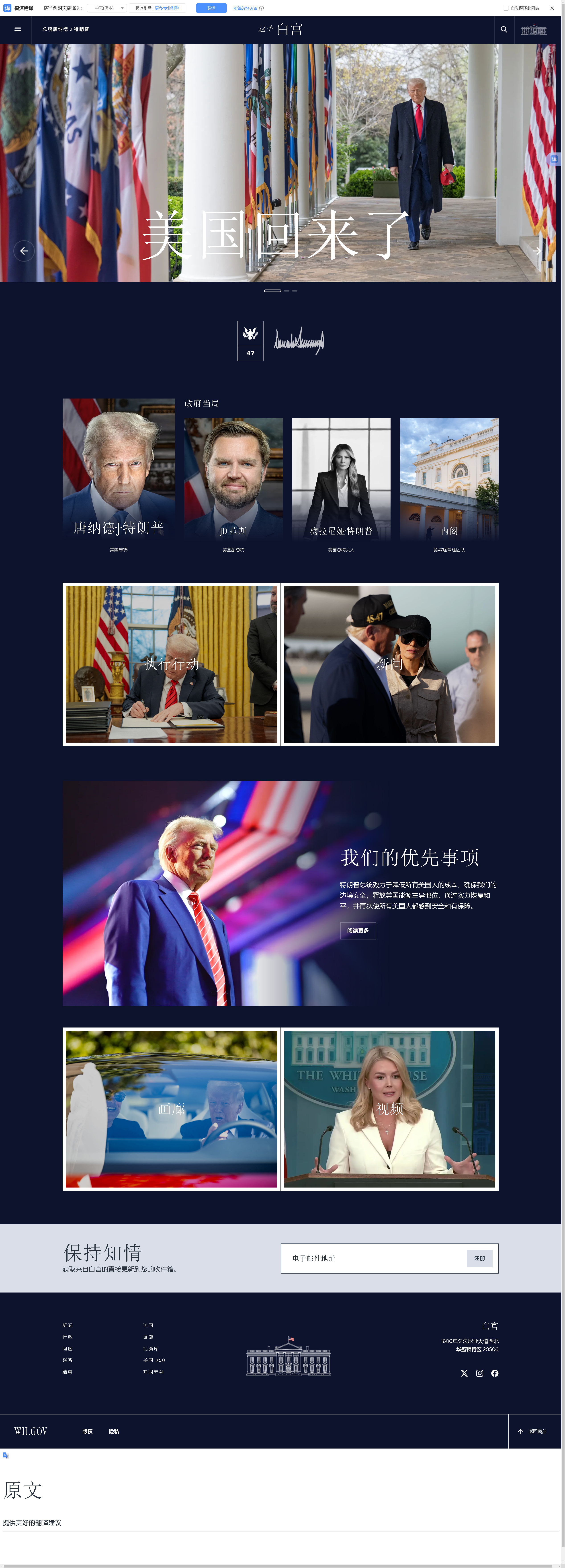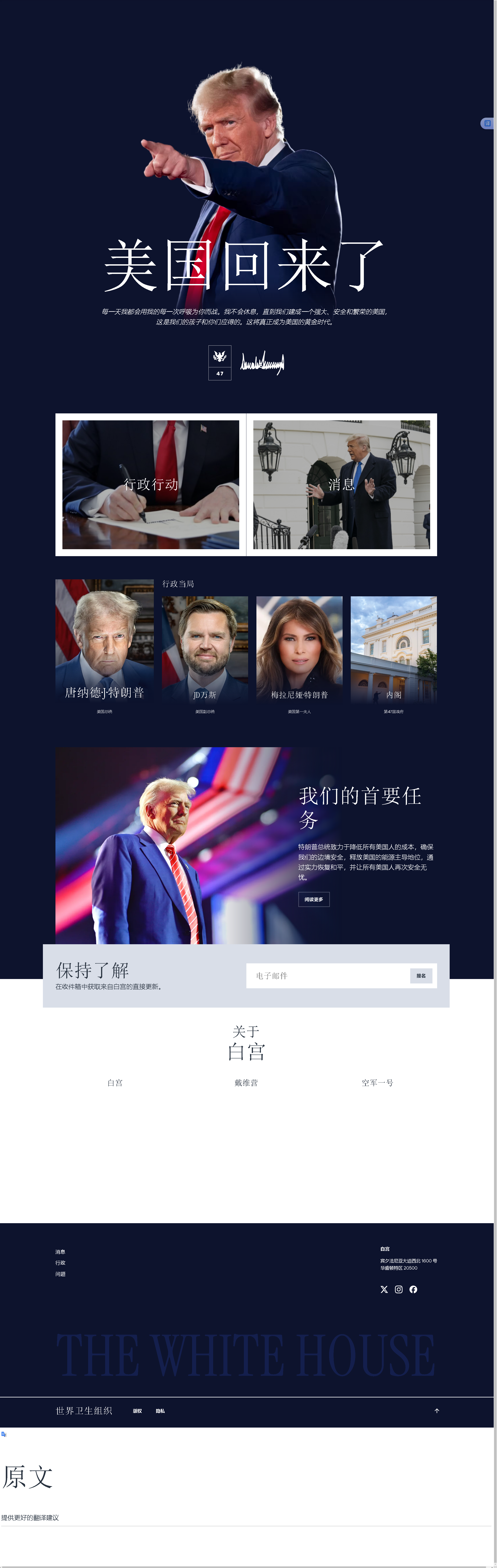 今天,白宮網(wǎng)站網(wǎng)頭悄悄地撤換特朗普的標志性肖像圖片,把指手改成了畫腳!而美國回來了下面“每一天我都會用我的每一次呼吸為你而戰(zhàn)。我不會休息,直到我們建成一個強大、安全和繁榮的美國,這是我們的孩子和你們應得的。這將真正成為美國的黃金時代”的配文也不見了!