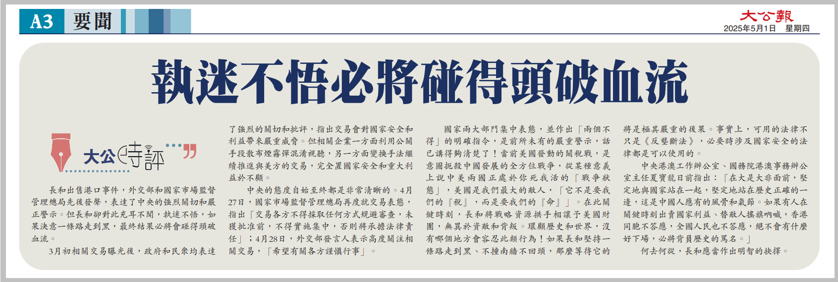 13 大公報:長和買賣不得人心 港各界:審查合情合理合法 2025-04-02
