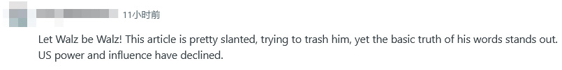 有網(wǎng)民評(píng)論稱:“這篇文章相當(dāng)傾斜,試圖抨擊他,但他言論中的基本事實(shí)顯而易見。美國的實(shí)力和影響力已經(jīng)衰落。”也有人表示:“他是對(duì)的,沒有人再指望美國發(fā)揮全球領(lǐng)導(dǎo)作用了。他們?yōu)槭裁磿?huì)呢?那些日子已經(jīng)一去不復(fù)返了?!?