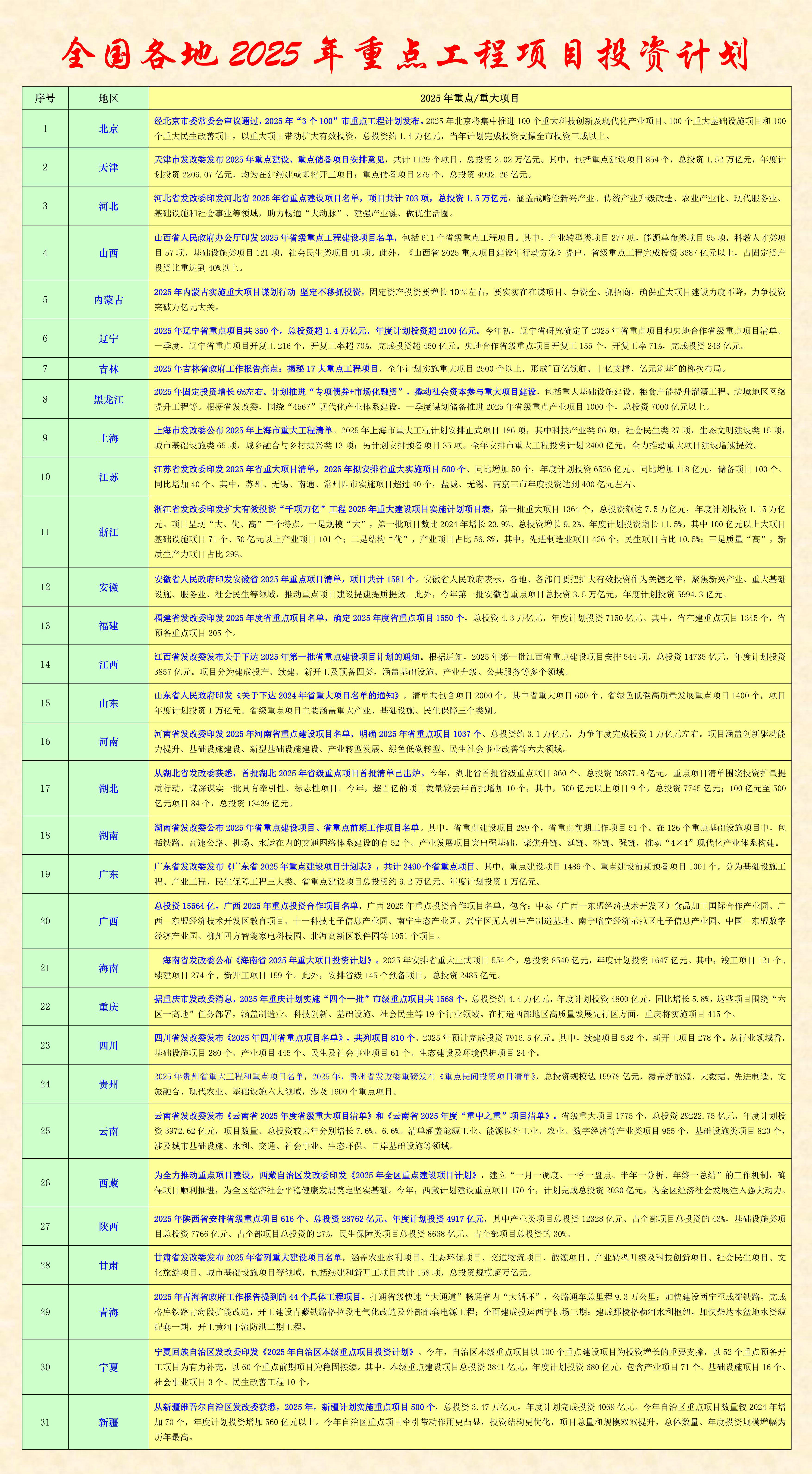 省發改委印發2025年省級重點項目清單,主要分為重大產業、重大基礎設施、重要民生環境三大類。今年,省首批省級重點項目960個、總投資39877.8億元,均較2024年大幅提升。