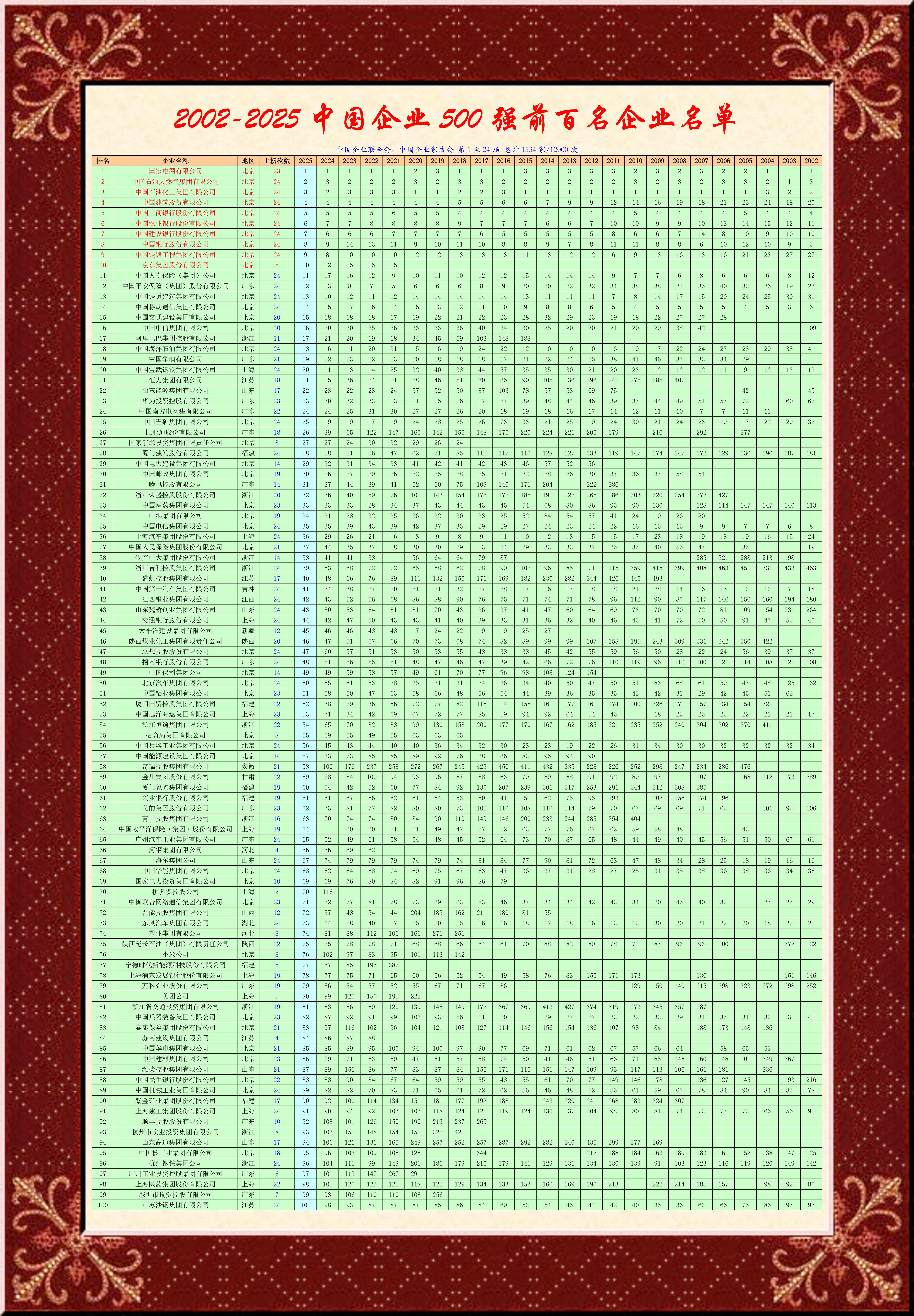 2025中國企業(yè)500強(qiáng)前百名上榜次數(shù)明細(xì)表