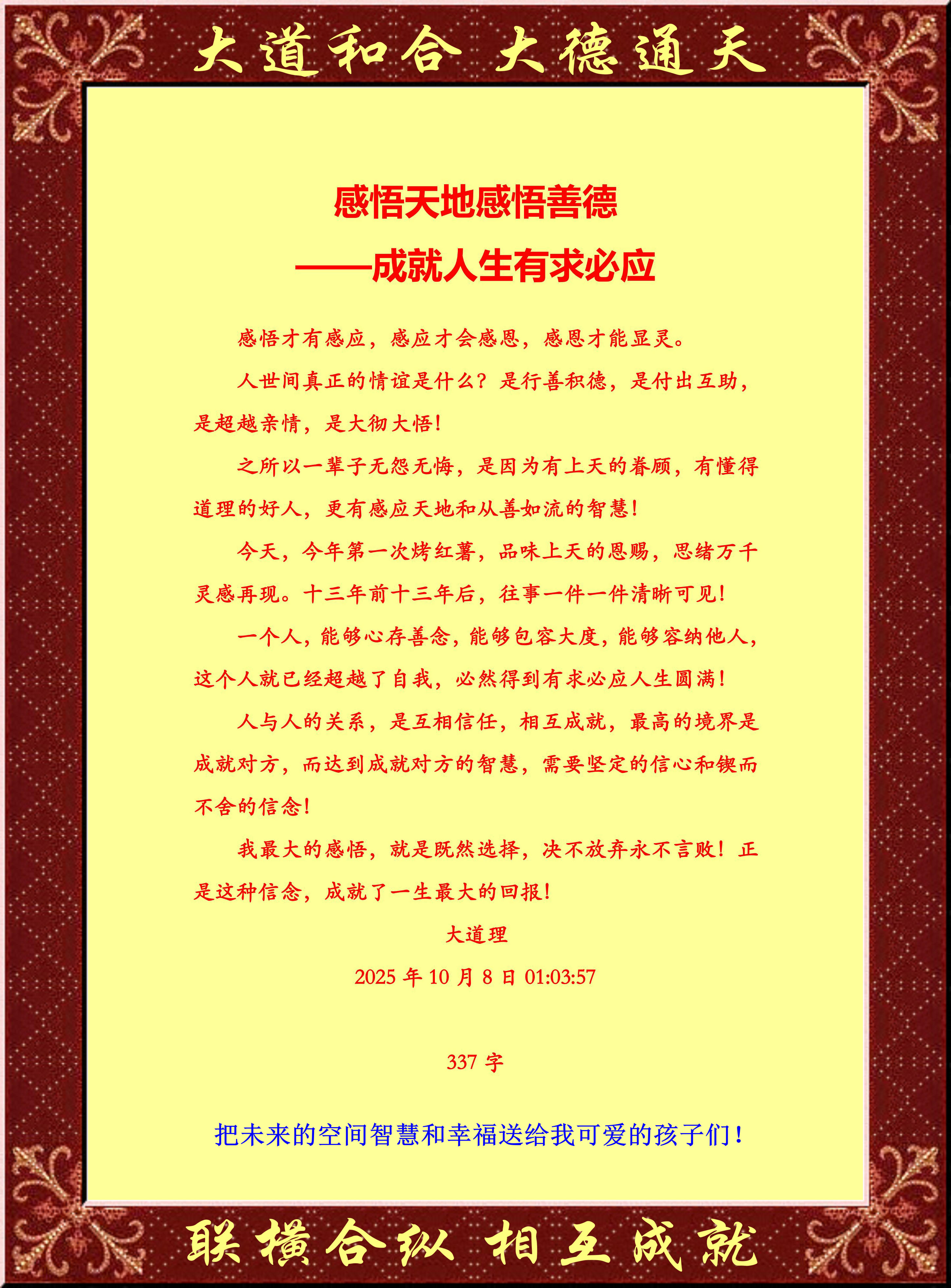 之所以一輩子無怨無悔,是因為有上天的眷顧,有懂得道理的好人,更有感應天地和從善如流的智慧!