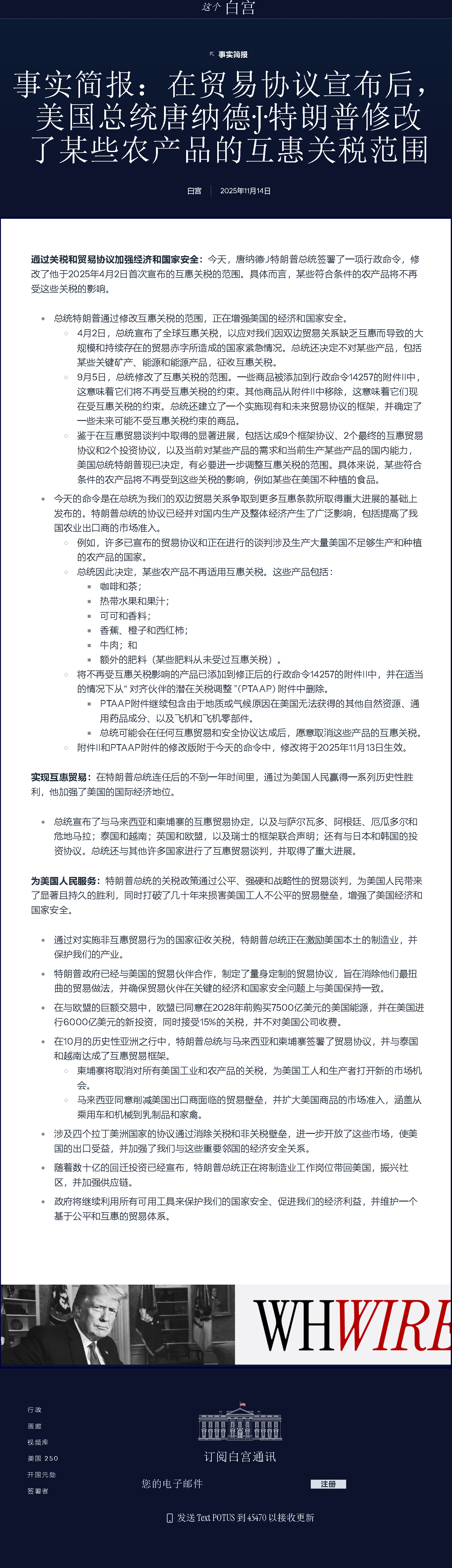 鑒于在互惠貿易談判中取得的顯著進展,包括達成9個框架協議、2個最終的互惠貿易協議和2個投資協議,以及當前對某些產品的需求和當前生產某些產品的國內能力,美國總統特朗普現已決定,有必要進一步調整互惠關稅的范圍。具體來說,某些符合條件的農產品將不再受到這些關稅的影響,例如某些在美國不種植的食品。