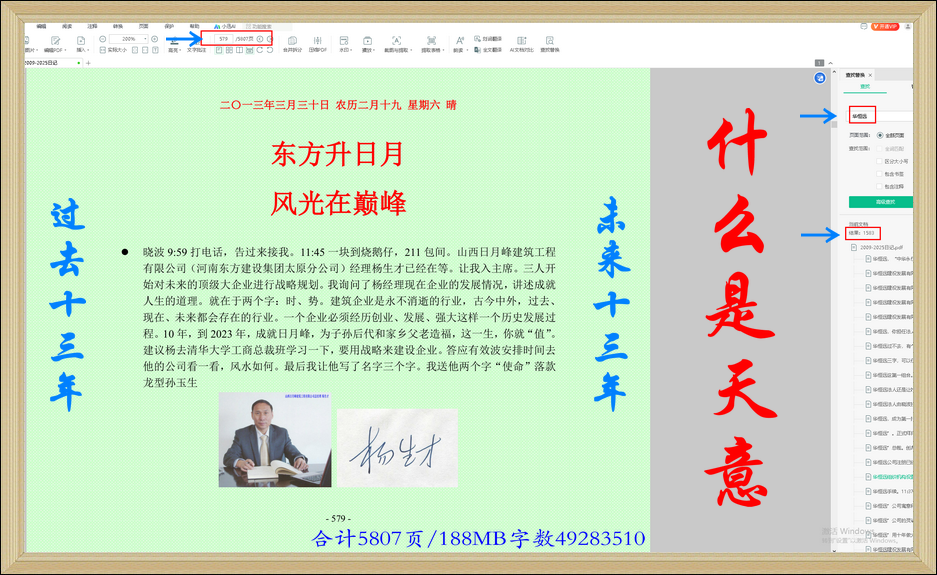 這本日記記錄了我從協(xié)會到山西二建再到日月峰和華恒遠(yuǎn)的所有工作,其中日月峰記錄1015處,最初是2012年8月19日曉波提起,2013年3月30日第一次涉足,揭開了長達(dá)十三年的“一企一策”民營企業(yè)發(fā)展戰(zhàn)略理論與實(shí)踐相結(jié)合的思考與感悟!
