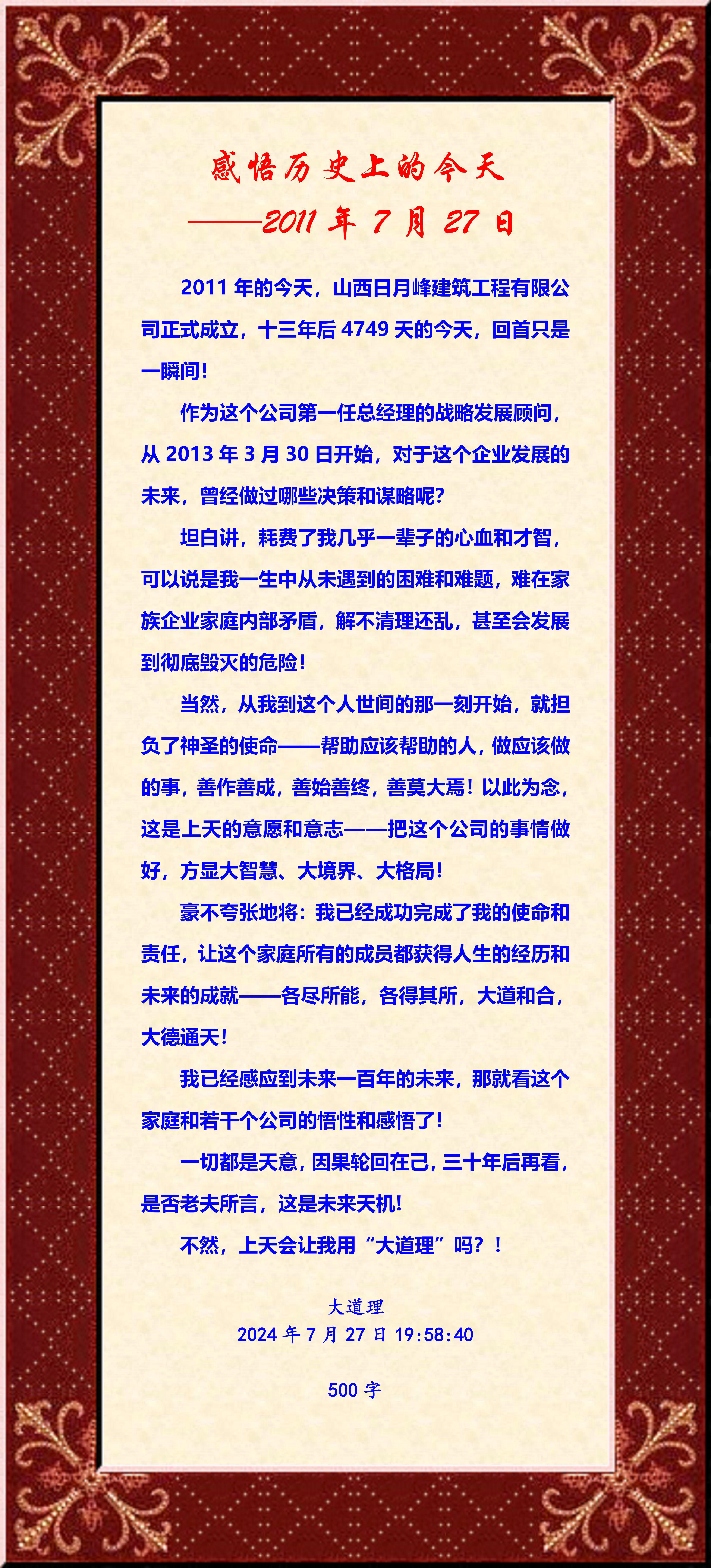 從下決心成就楊生才和日月峰對(duì)未來(lái)的愿望以來(lái),可以說(shuō)是按天記時(shí)不分晝夜不知疲倦夜以繼日操勞的!這樣的情形,只有冥冥之中的上天知道我的良苦用心!為什么出現(xiàn)事與愿違的結(jié)果?這也是上天的安排,讓不懂道與理善和德,不懂人生與事業(yè)和未來(lái),更不懂如何管理企業(yè)和經(jīng)營(yíng)的人,在實(shí)踐和挫折中感悟?qū)W習(xí)和進(jìn)步!