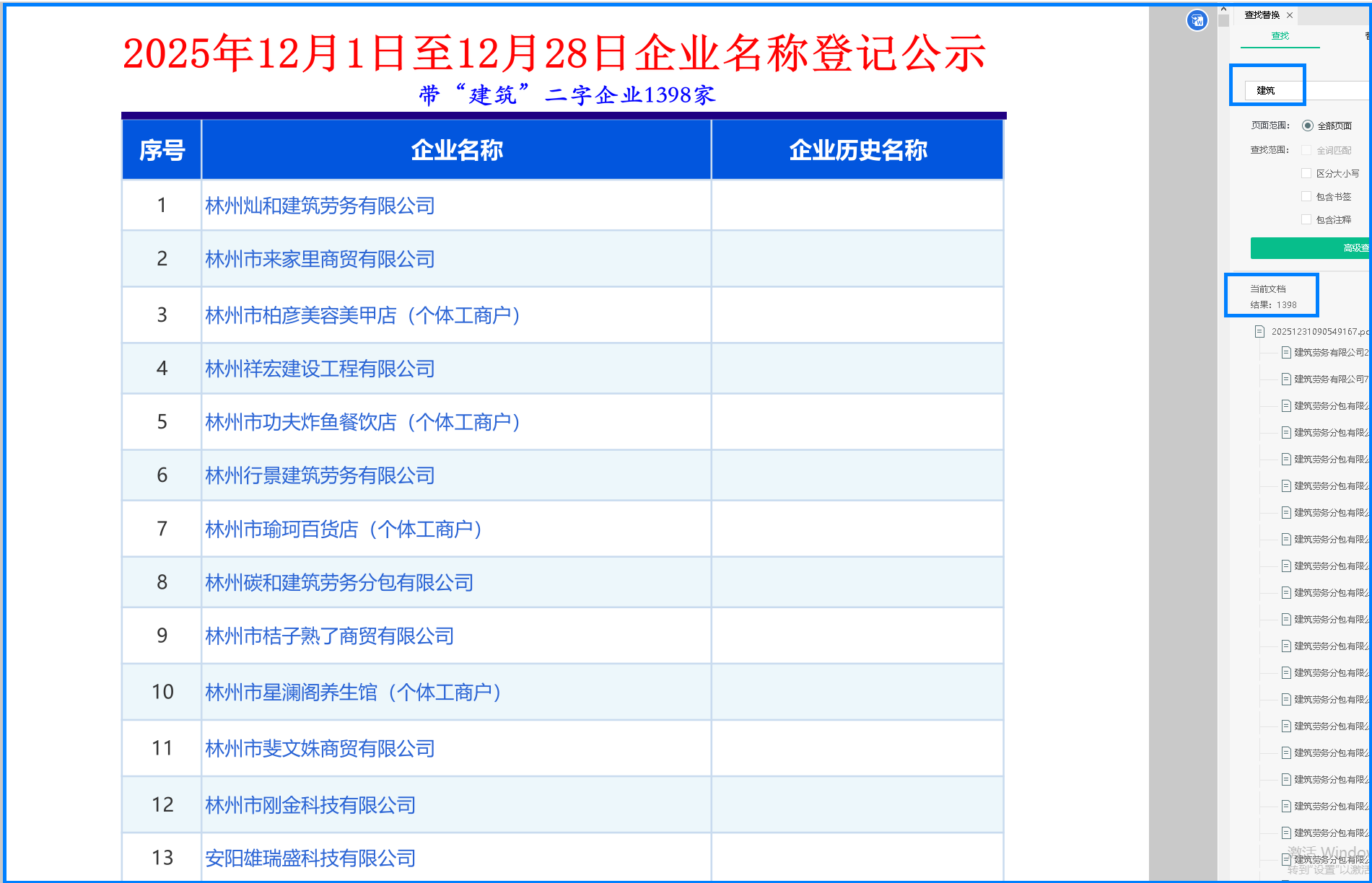 剛才,閉著眼睛在收藏夾隨便一點,竟然打開了這個頁面,看看2025年12月1日至12月28日企業名稱登記公示,下載轉換,使用“高級查詢”,立即出現帶“建筑”二字的企業注冊數1398家!如果再進一步排序,恐怕要比這個數更多!