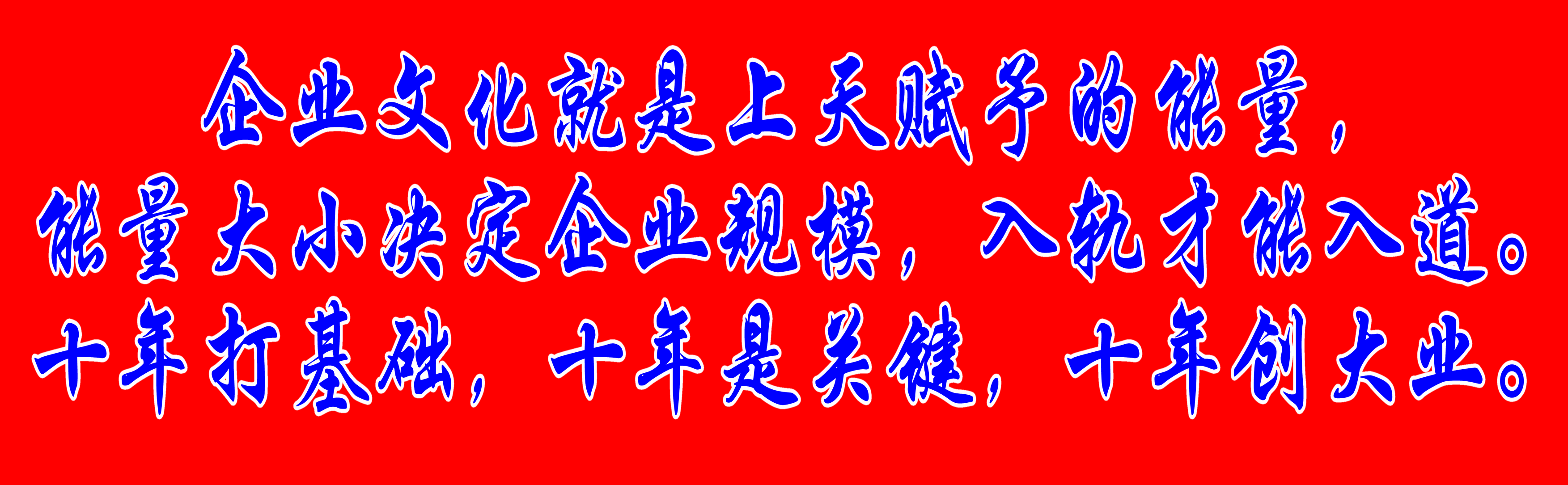 企業文化就是上天賦予的能量,能量大小決定企業規模,入軌才能入道。十年打基礎,十年是關鍵,十年創大業。