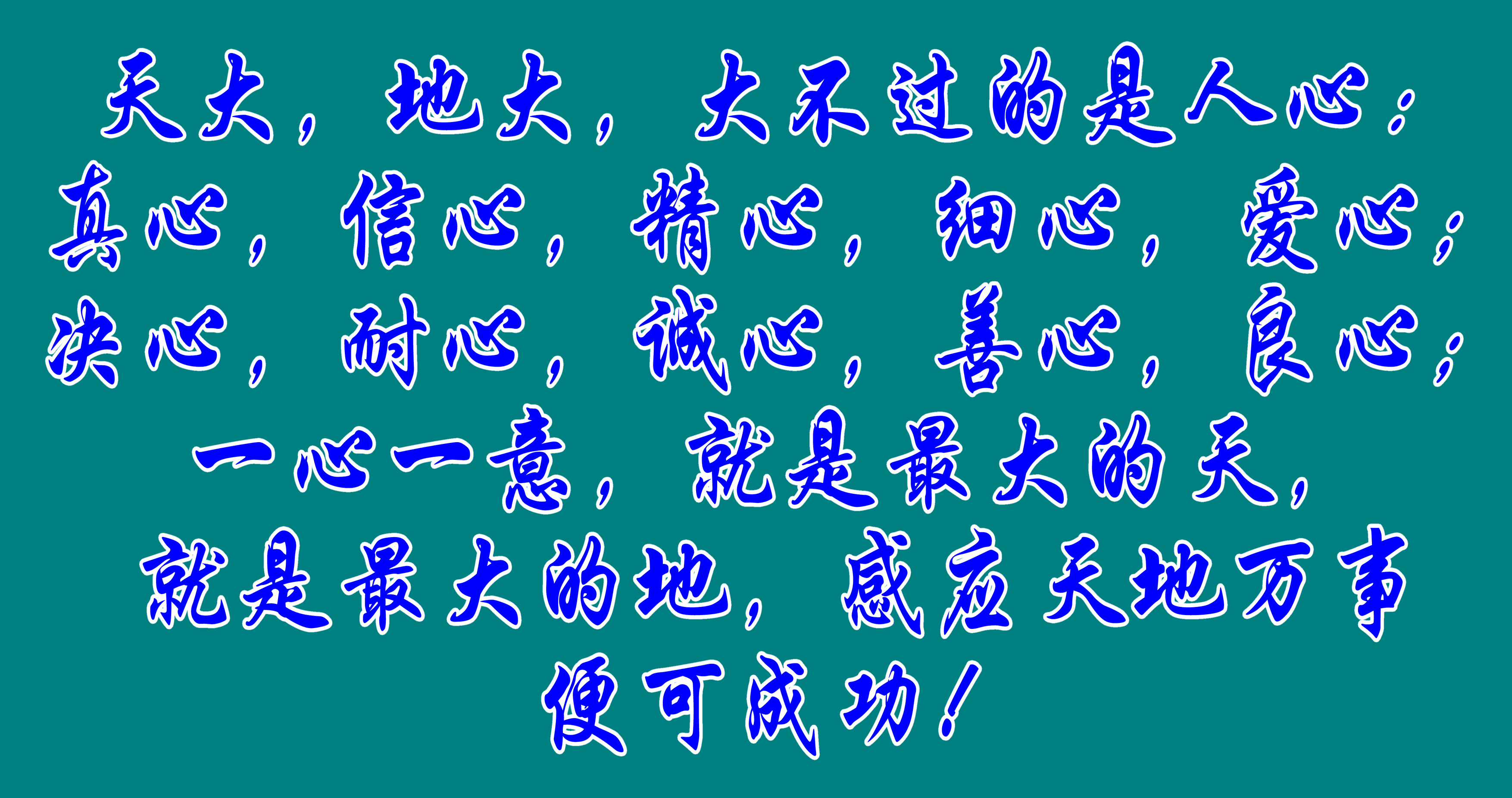 天大,地大,大不過的是人心:真心,信心,精心,細心,愛心;決心,耐心,誠心,善心,良心;一心一意,就是最大的天,就是最大的地,感應天地萬事便可成功!