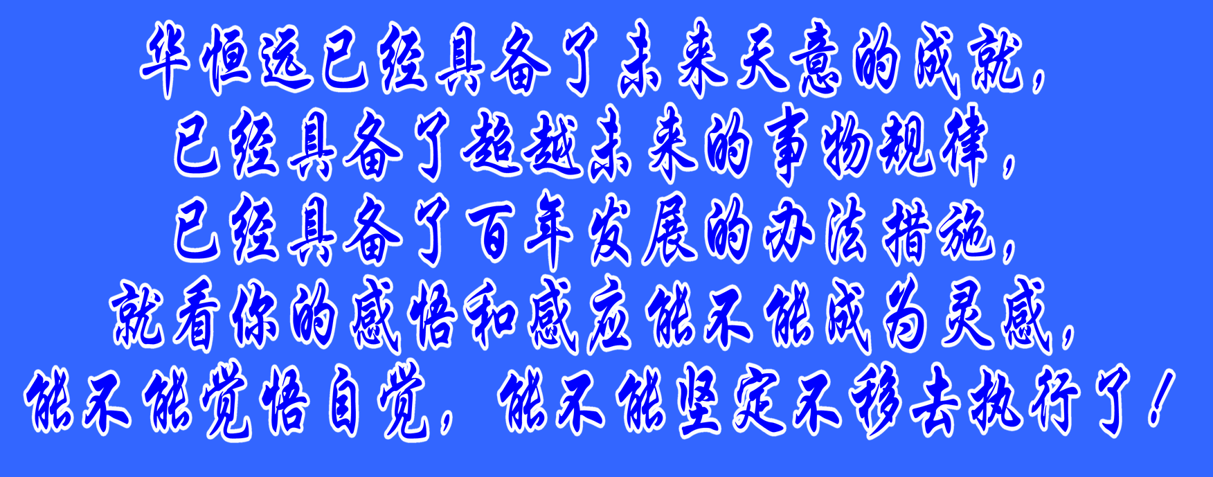 華恒遠已經具備了未來天意的成就,已經具備了超越未來的事物規律,已經具備了百年發展的辦法措施,就看你的感悟和感應能不能成為靈感,能不能覺悟自覺,能不能堅定不移去執行了!