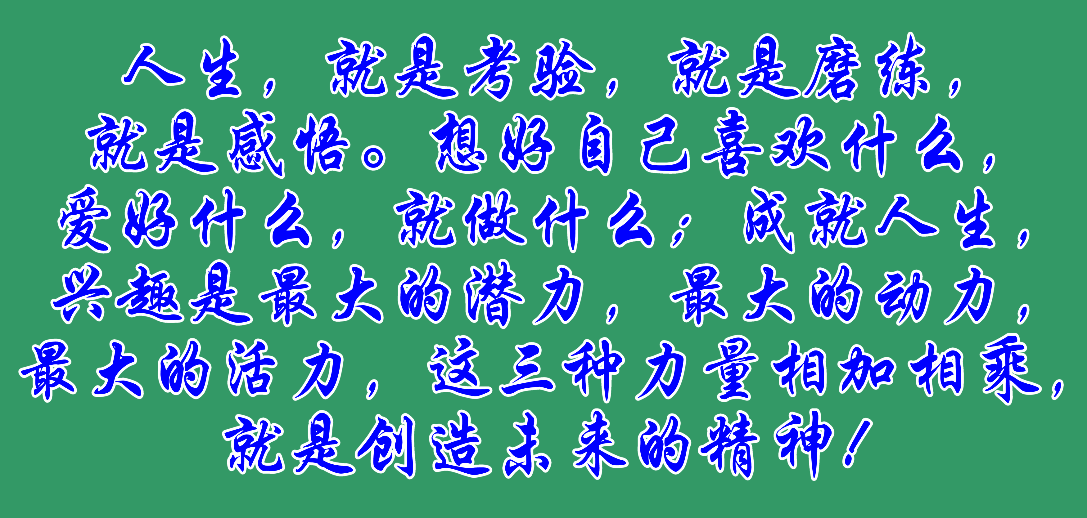 人生,就是考驗(yàn),就是磨練,就是感悟。想好自己喜歡什么,愛好什么,就做什么;成就人生,興趣是最大的潛力,最大的動力,最大的活力,這三種力量相加相乘,就是創(chuàng)造未來的精神!