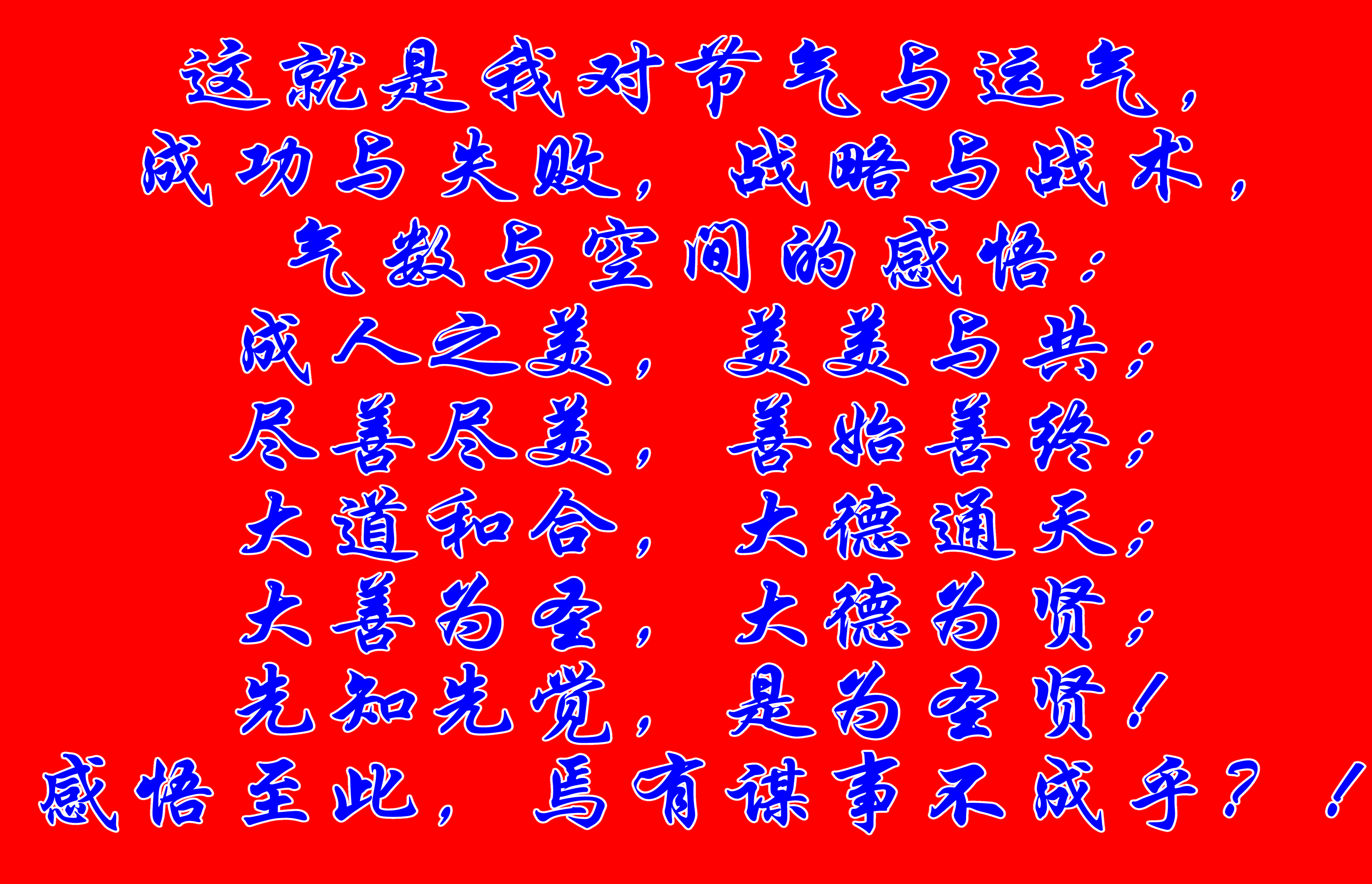 這就是我對(duì)節(jié)氣與運(yùn)氣,成功與失敗,戰(zhàn)略與戰(zhàn)術(shù),氣數(shù)與空間的感悟:成人之美,美美與共;盡善盡美,善始善終;大道和合,大德通天;大善為圣,大德為賢;先知先覺(jué),是為圣賢!感悟至此,焉有謀事不成乎?!