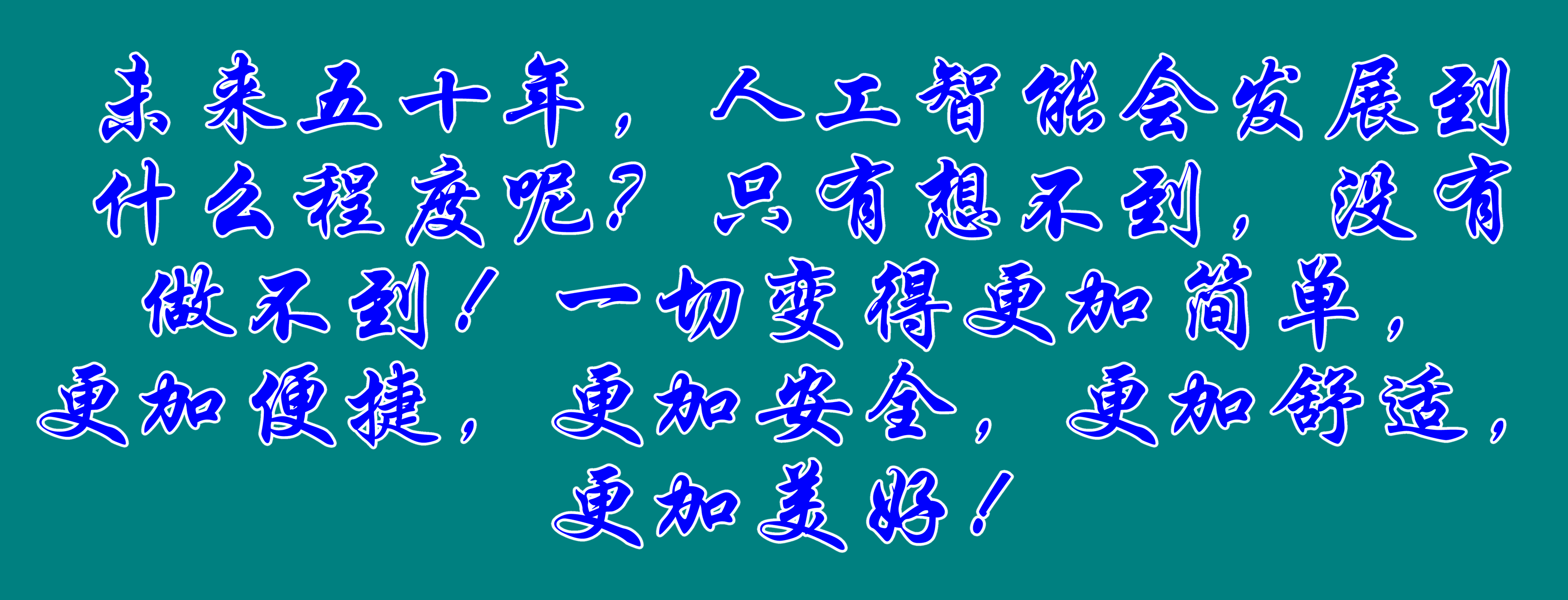 未來五十年,人工智能會發展到什么程度呢?只有想不到,沒有做不到!一切變得更加簡單,更加便捷,更加安全,更加舒適,更加美好!