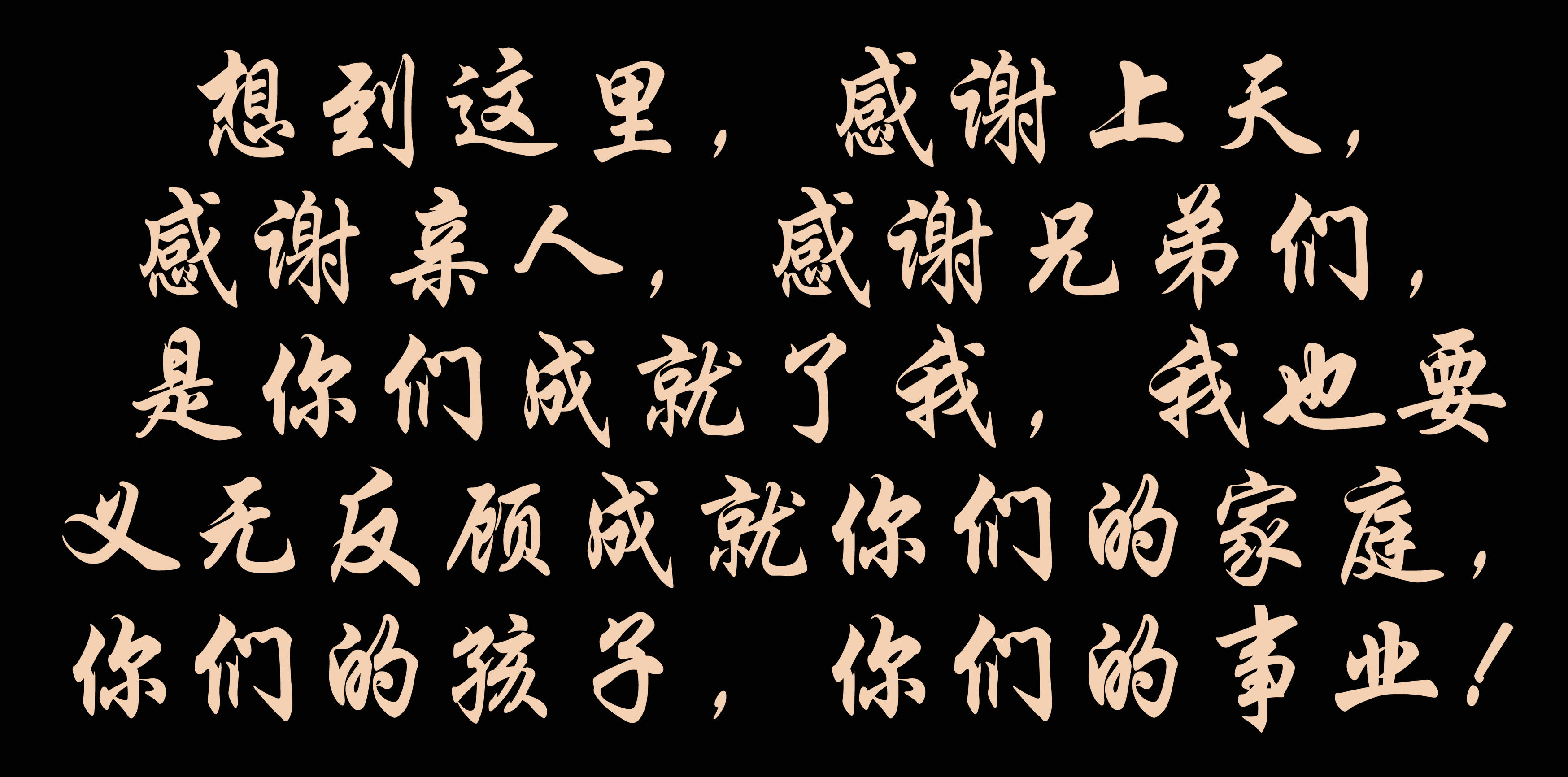 想到這里,感謝上天,感謝親人,感謝兄弟們,是你們成就了我,我也要義無反顧成就你們的家庭,你們的孩子,你們的事業!