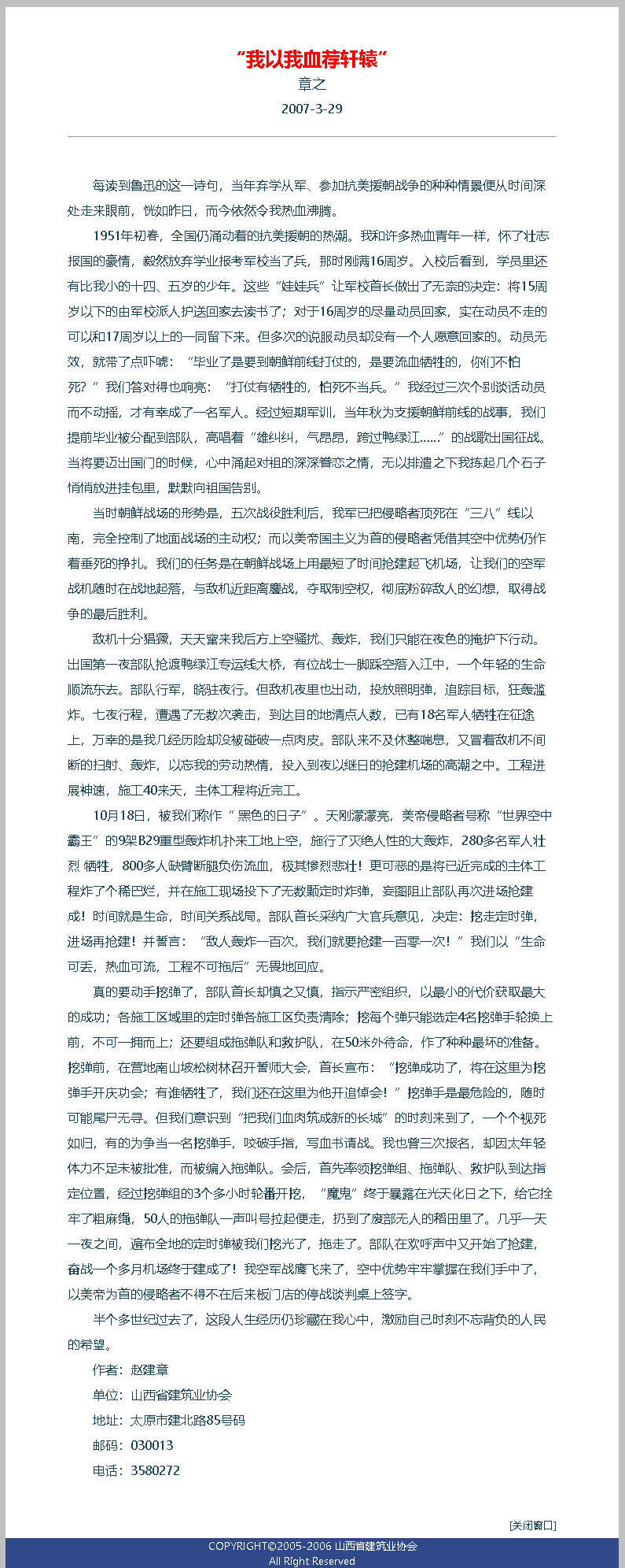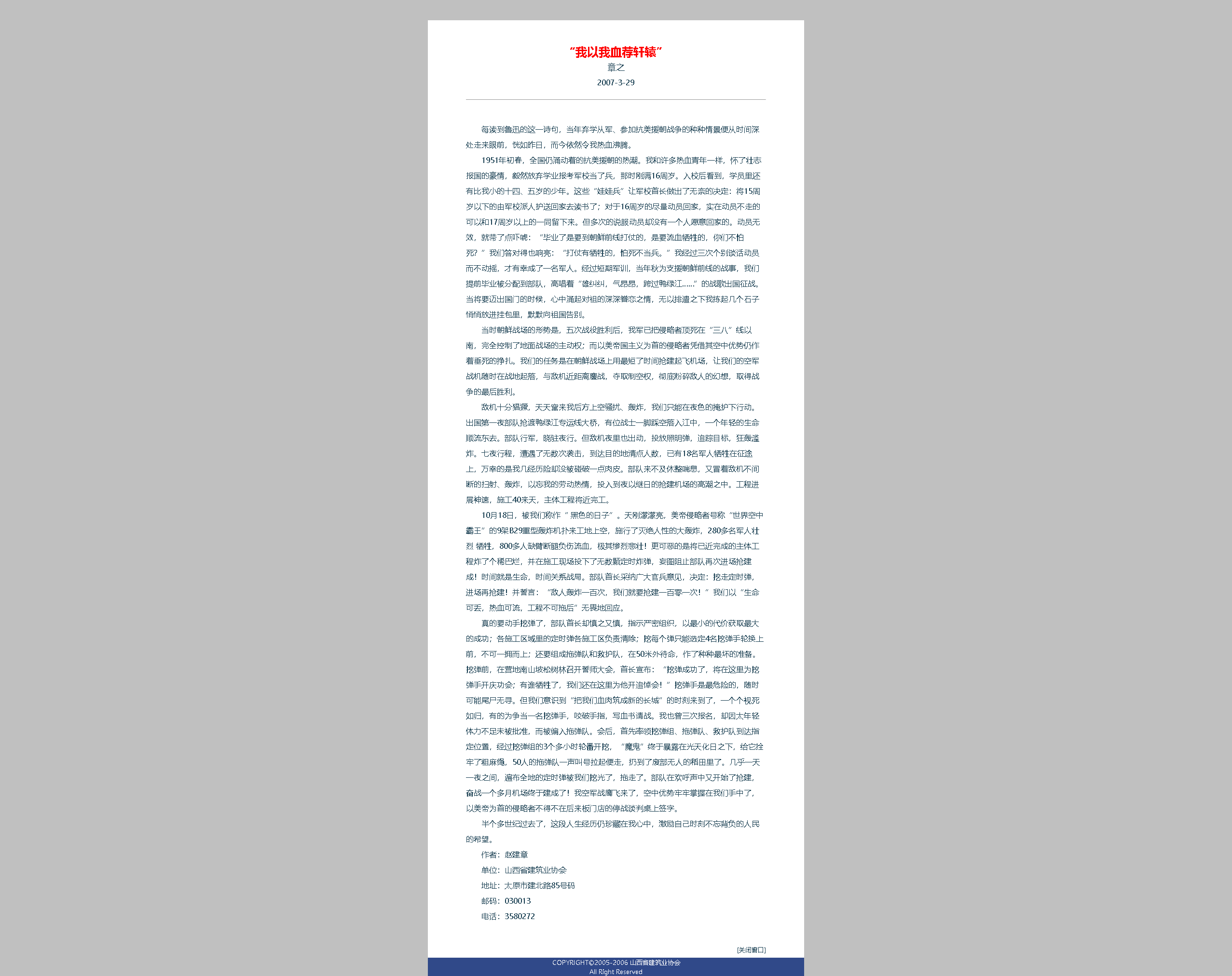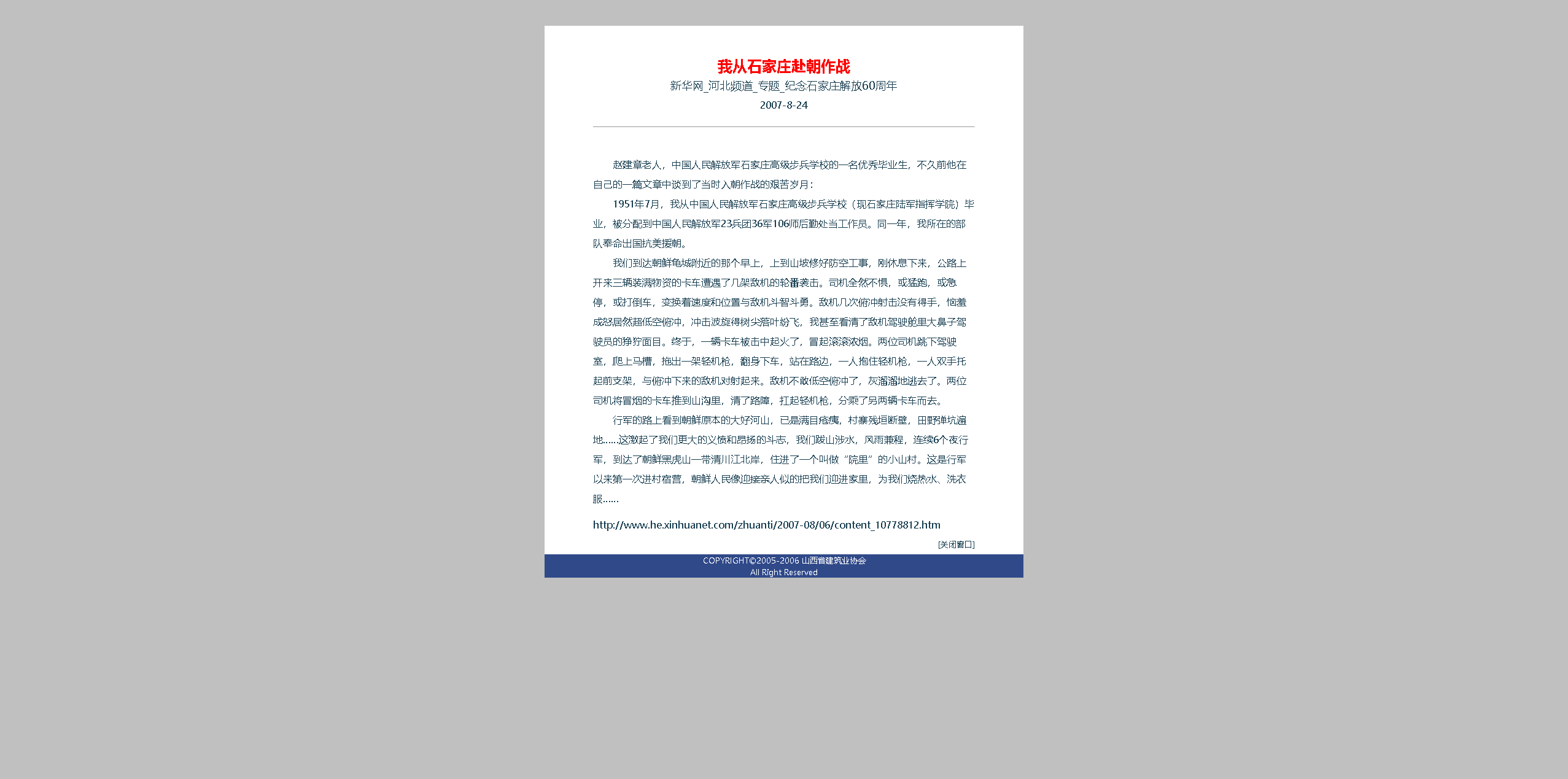 下面三篇文章,是十六年前在建筑業(yè)協(xié)會時(shí),發(fā)表在協(xié)會網(wǎng)上的若干文章,證明一個抗美援朝老兵的回憶錄。
