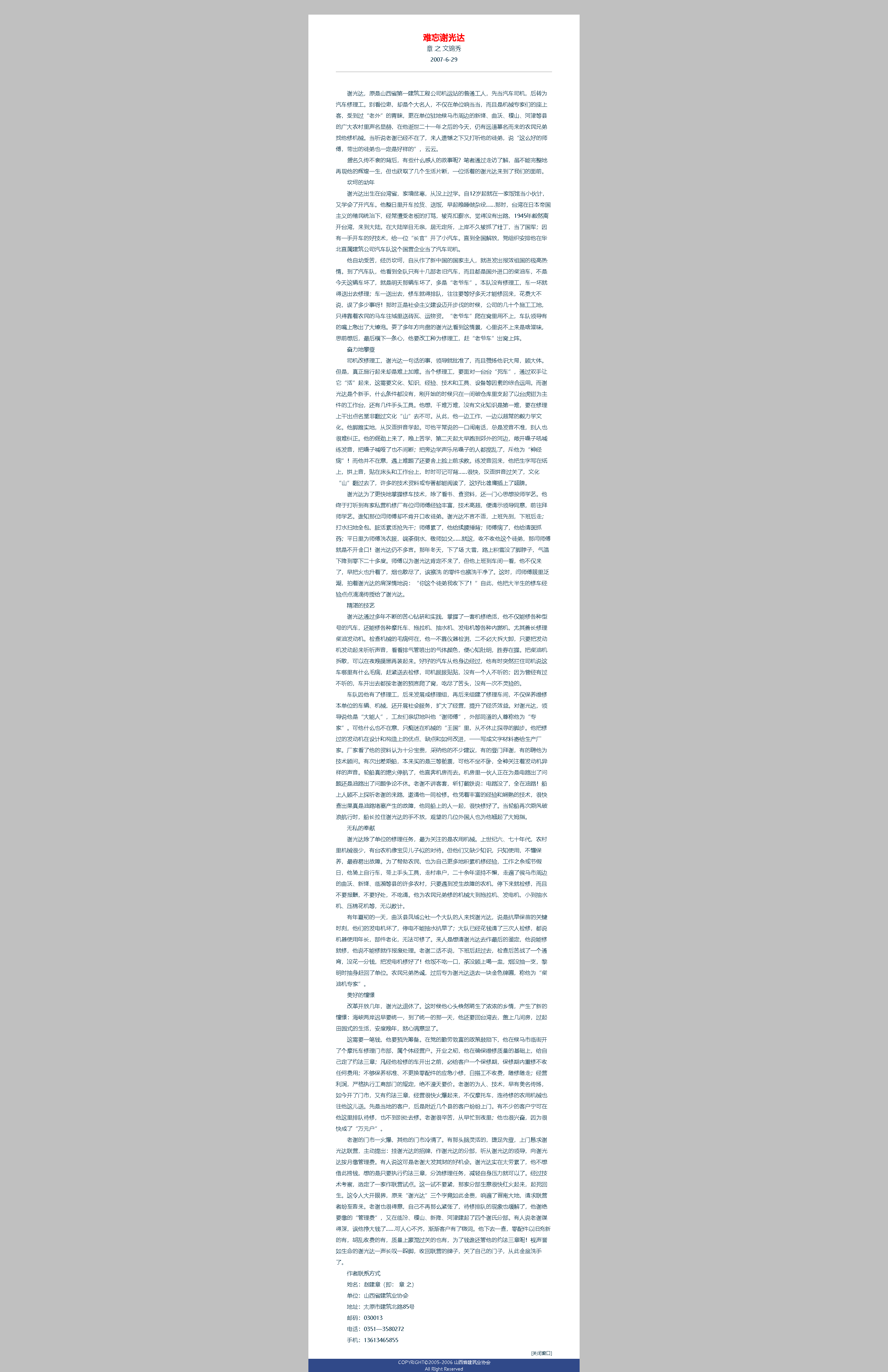 他叫趙建章,章之是他的筆名。1935年生人,河北定洲人,原省建一公司辦公室高級文秘,省建總公司駐北京辦事處主任,建筑業(yè)協(xié)會會刊編輯部負(fù)責(zé)人。