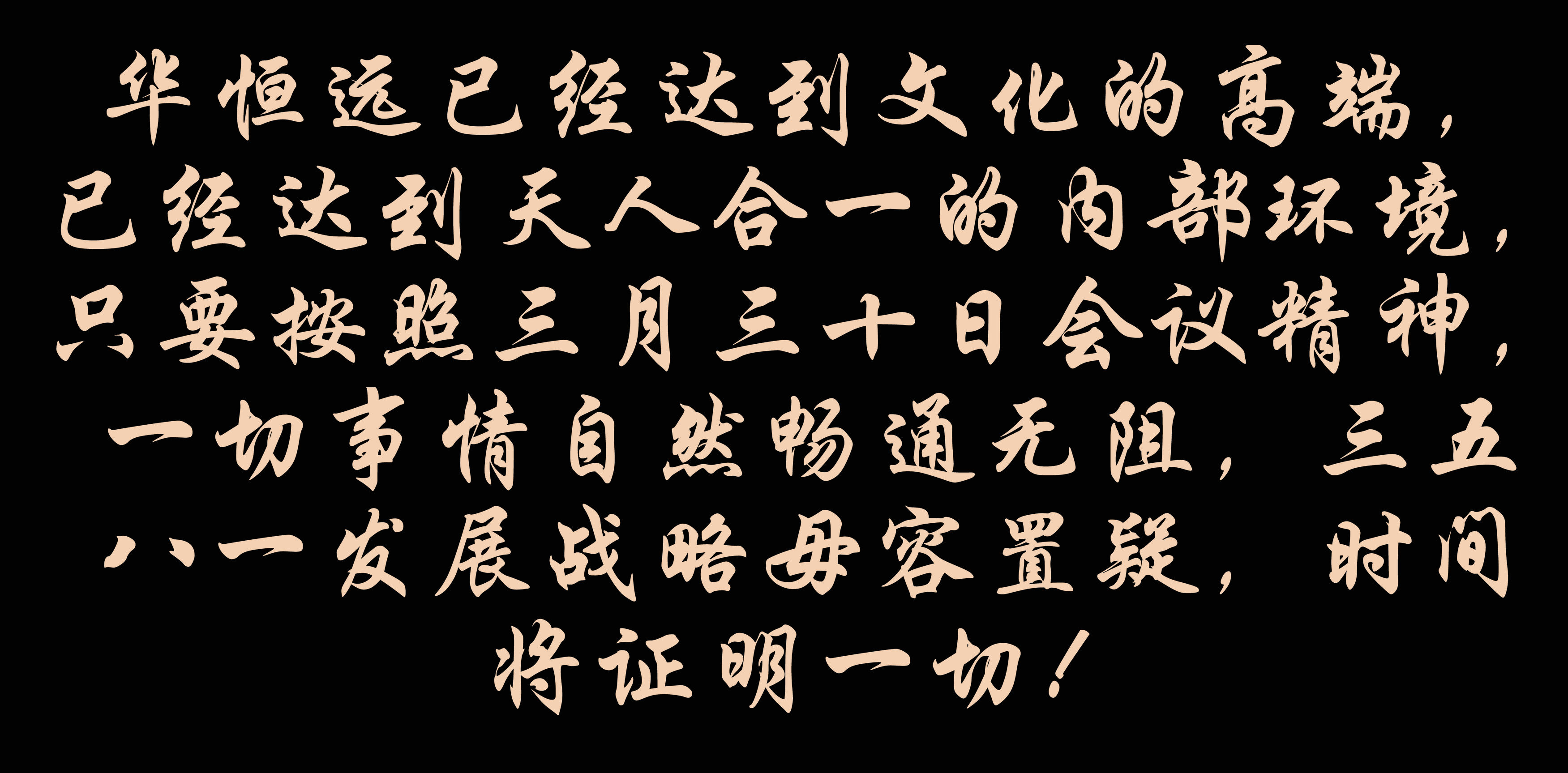 華恒遠(yuǎn)已經(jīng)達(dá)到文化的高端,已經(jīng)達(dá)到天人合一的內(nèi)部環(huán)境,只要按照三月三十日會(huì)議精神,一切事情自然暢通無(wú)阻,三五八一發(fā)展戰(zhàn)略毋容置疑,時(shí)間將證明一切!看到我的文章,看懂我的文章,必定是成大氣候的人才!