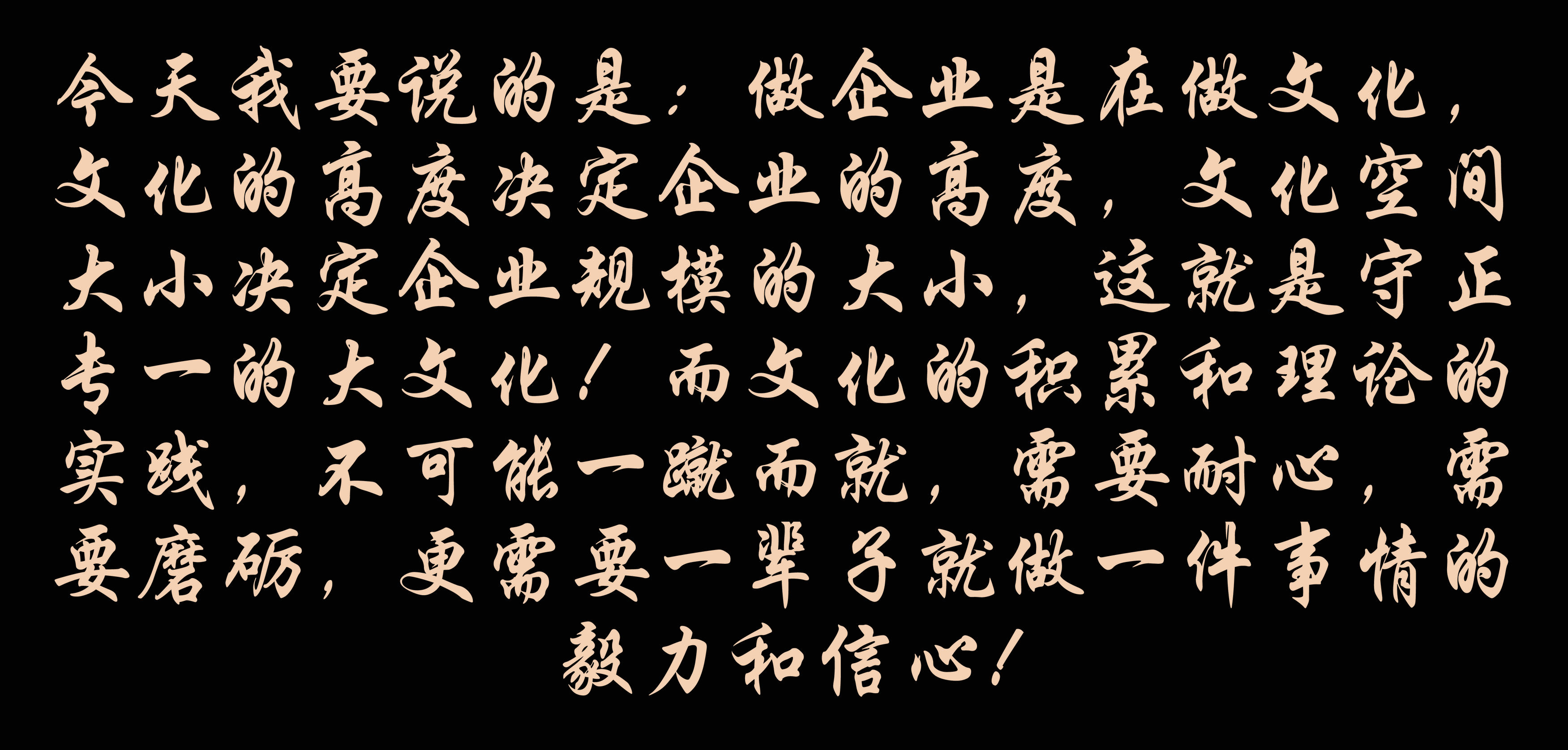 今天我要說(shuō)的是:做企業(yè)是在做文化,文化的高度決定企業(yè)的高度,文化空間大小決定企業(yè)規(guī)模的大小,這就是守正專一的大文化!而文化的積累和理論的實(shí)踐,不可能一蹴而就,需要耐心,需要磨礪,更需要一輩子就做一件事情的毅力和信心!