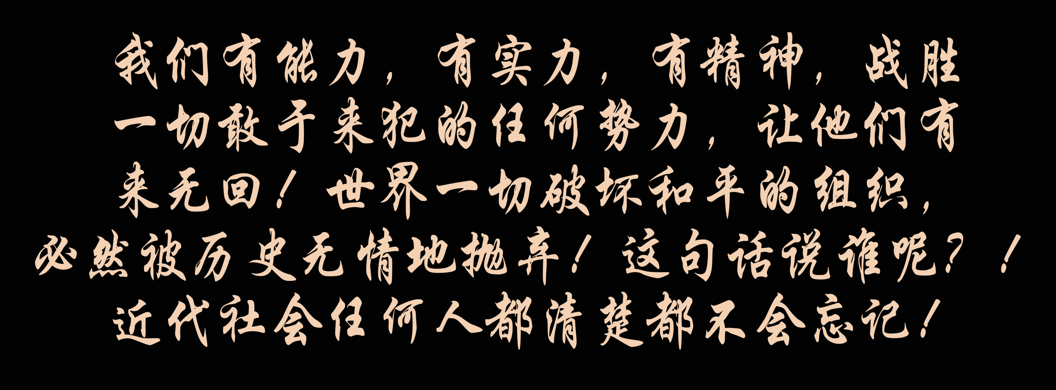 我們有能力,有實力,有精神,戰勝一切敢于來犯的任何勢力,讓他們有來無回!世界一切破壞和平的組織,必然被歷史無情地拋棄!這句話說誰呢?!近代社會任何人都清楚都不會忘記!
