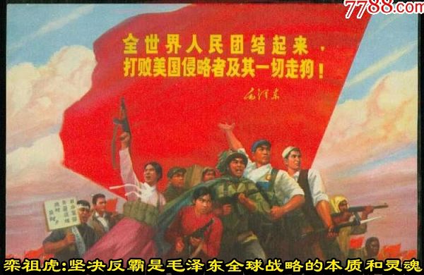“社會主義陣營各國人民要聯合起來,亞洲、非洲、拉丁美洲各國人民要聯合起來,全世界各大洲的人民要聯合起來,所有愛好和平的國家要聯合起來,所有受到美國侵略、控制、干涉和欺負的國家要聯合起來,結成最廣泛的統一戰線,反對美帝國主義的侵略政策和戰爭政策,保衛世界和平。”“美帝國主義到處橫行霸道,把它自己放在同全世界人民為敵的地位,使它自己越來越陷于孤立。美帝國主義手里的原子彈、氫彈,是嚇不倒一切不愿意做奴隸的人們的。全世界人民反對美國侵略者的怒潮是不可阻擋的。全世界人民反對美帝國主義及其走狗的斗爭一定會取得更加偉大的勝利。”(毛澤東《中國人民堅決支持巴拿馬人民的愛國正義斗爭》,一九六四年一月十二日)