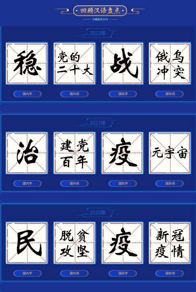 “漢語盤點2023”活動由國家語言資源監(jiān)測與研究中心、商務(wù)印書館、新華網(wǎng)聯(lián)合主辦,11月20日在京啟動。據(jù)主辦方介紹,活動受到社會廣泛關(guān)注和全民熱情參與,目前已收到推薦字詞數(shù)千條,在綜合網(wǎng)友推薦和專家評議基礎(chǔ)上,選出以上各組前五位年度候選字和前五位年度候選詞,并最終從中選出一個字和一個詞作為“2023年度字詞”,揭曉儀式將于12月20日在京舉行。