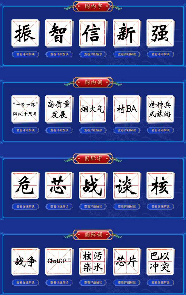 前五位年度國內(nèi)候選字為“振”“智”“信”“新”“強”,前五位年度國內(nèi)候選詞為“‘一帶一路’倡議十周年”“高質(zhì)量發(fā)展”“煙火氣”“村BA”“特種兵式旅游”;前五位年度國際候選字為“危”“芯”“戰(zhàn)”“談”“核”,前五位年度國際候選詞為“戰(zhàn)爭”“ChatGPT”“核污染水”“芯片”“巴以沖突”。