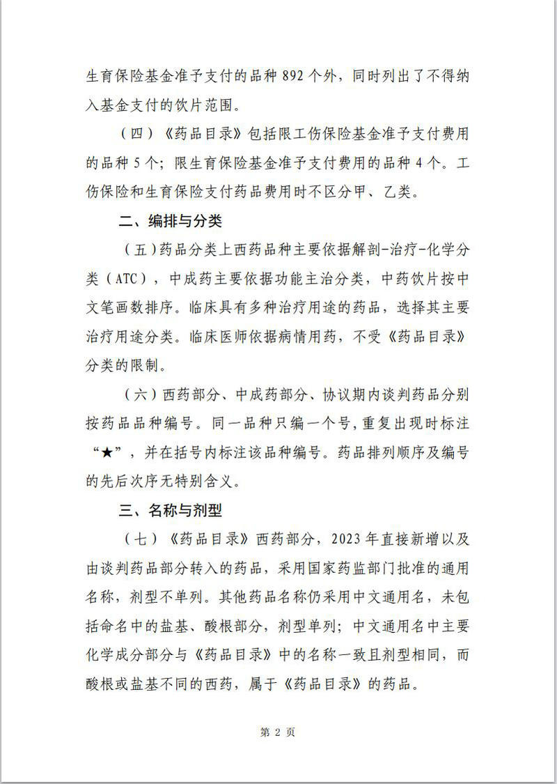 (七)《藥品目錄》西藥部分,2023年直接新增以及由談判藥品部分轉入的藥品,采用國家藥監部門批準的通用名稱,劑型不單列。其他藥品名稱仍采用中文通用名,未包括命名中的鹽基、酸根部分,劑型單列;中文通用名中主要化學成分部分與《藥品目錄》中的名稱一致且劑型相同,而酸根或鹽基不同的西藥,屬于《藥品目錄》的藥品。