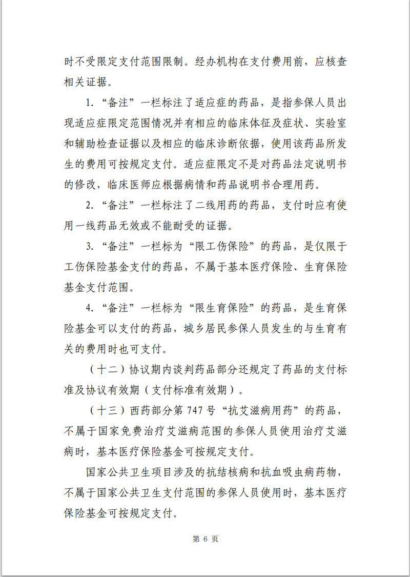 (十一)“備注”欄中對部分藥品規定了限定支付范圍,是指符合規定情況下參保人員發生的藥品費用,可按規定由基本醫療保險或生育保險基金支付。工傷保險支付藥品費用時不受限定支付范圍限制。經辦機構在支付費用前,應核查相關證據。