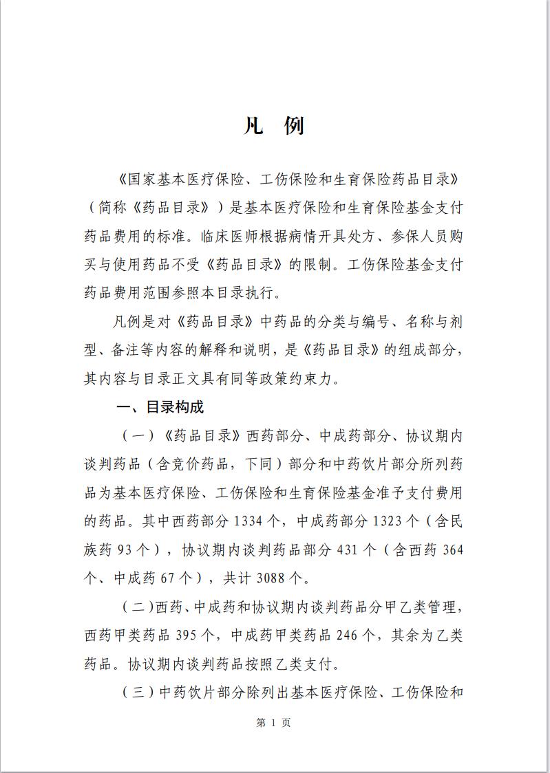 (一)《藥品目錄》西藥部分、中成藥部分、協議期內談判藥品(含競價藥品,下同)部分和中藥飲片部分所列藥品為基本醫療保險、工傷保險和生育保險基金準予支付費用的藥品。其中西藥部分1334個,中成藥部分1323個(含民族藥93個),協議期內談判藥品部分431個(含西藥364個、中成藥67個),共計3088個。