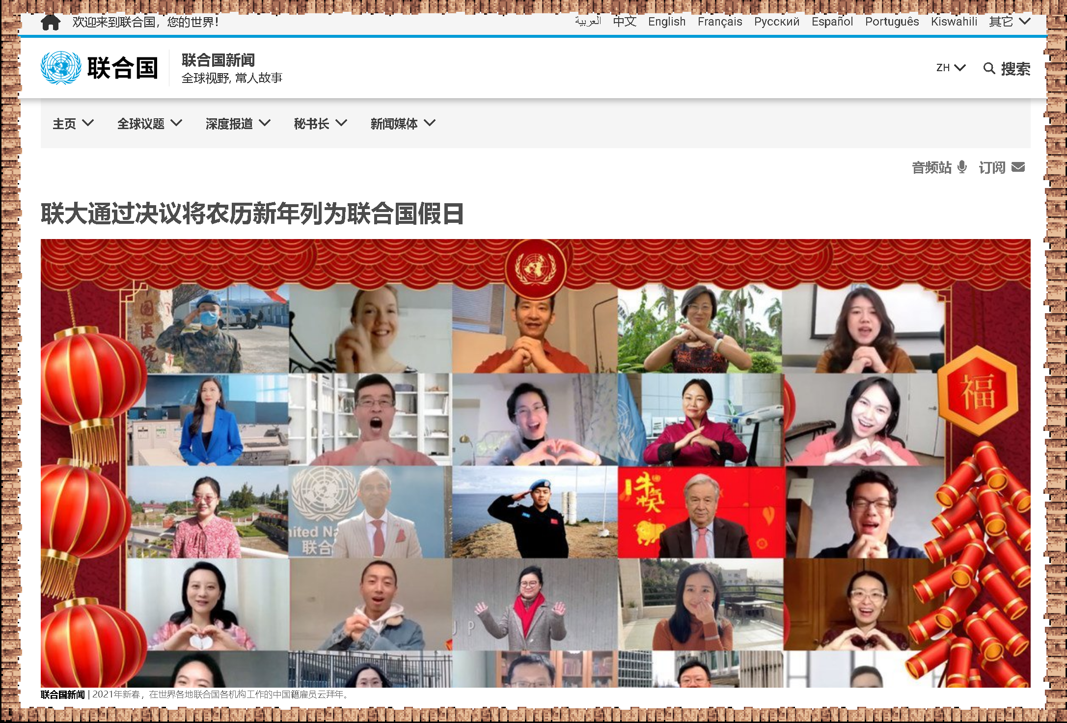 新華社北京12月24日電 日前,聯合國大會通過決議,將春節(農歷新年)確定為聯合國假日。中國常駐聯合國代表團臨時代辦戴兵說,聯大決議將春節確定為聯合國假日,得到了聯合國會員國和聯合國秘書處工作人員的熱烈歡迎和踴躍支持。春節歷史源遠流長,起源于中國,但已走向全世界,成為許多國家一年中最重要的節慶之一,一些國家還將其列入法定假日。