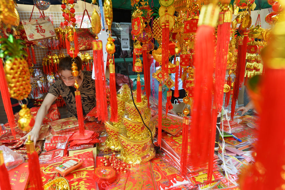 一名商販在泰國曼谷唐人街的攤位上擺放春節飾品。新華社發(拉亨攝)