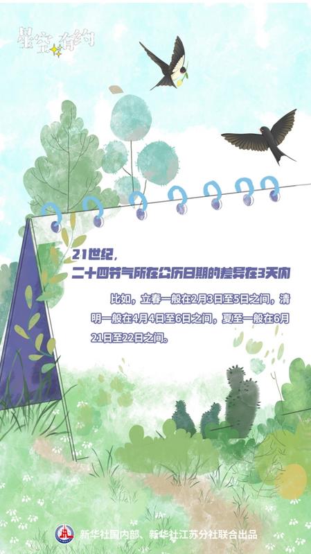 公歷紀年中,平年為365天,若相鄰兩年同一節氣間相隔的是平年,則同一個節氣在后一年比前一年的時間推后約5小時49分鐘。如此,累積4年便會推遲近一天。公歷歷法使用設置閏年的方法來彌補時間差。每一個可以被4整除的年份是閏年,多出2月29日一天,但整世紀必須被400整除才置閏年。“因為存在閏年,節氣所在的公歷日期不會一直后移。21世紀中,二十四節氣所在的公歷日期差異在3天內。比如,立春一般在2月3日至5日之間,清明一般在4月4日至6日之間,夏至一般在6月21日至22日之間。”王科超說。