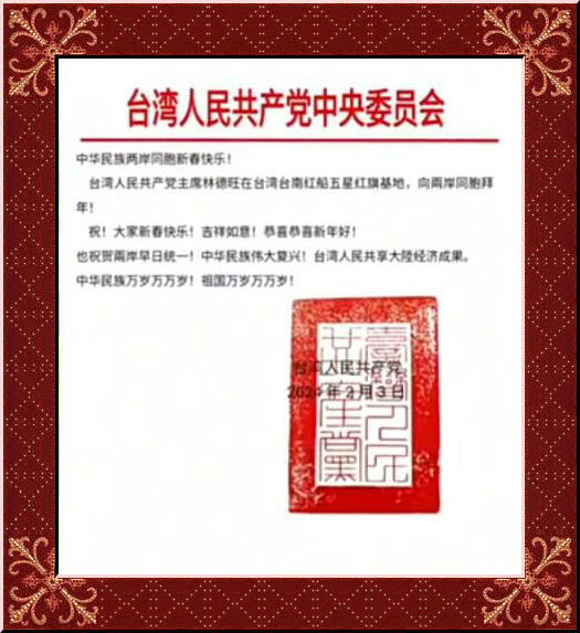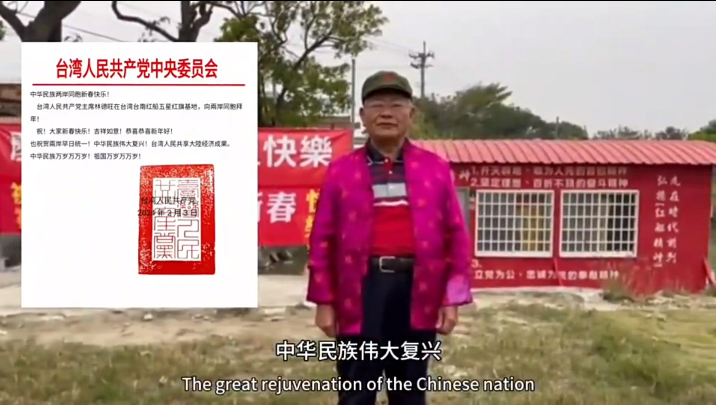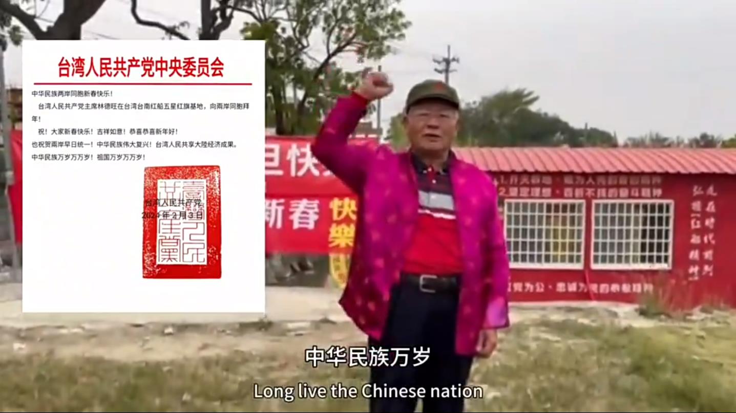 臺(tái)灣人民共產(chǎn)黨主席林德旺在臺(tái)灣臺(tái)南紅船五星紅旗基地,向兩岸同胞拜年!