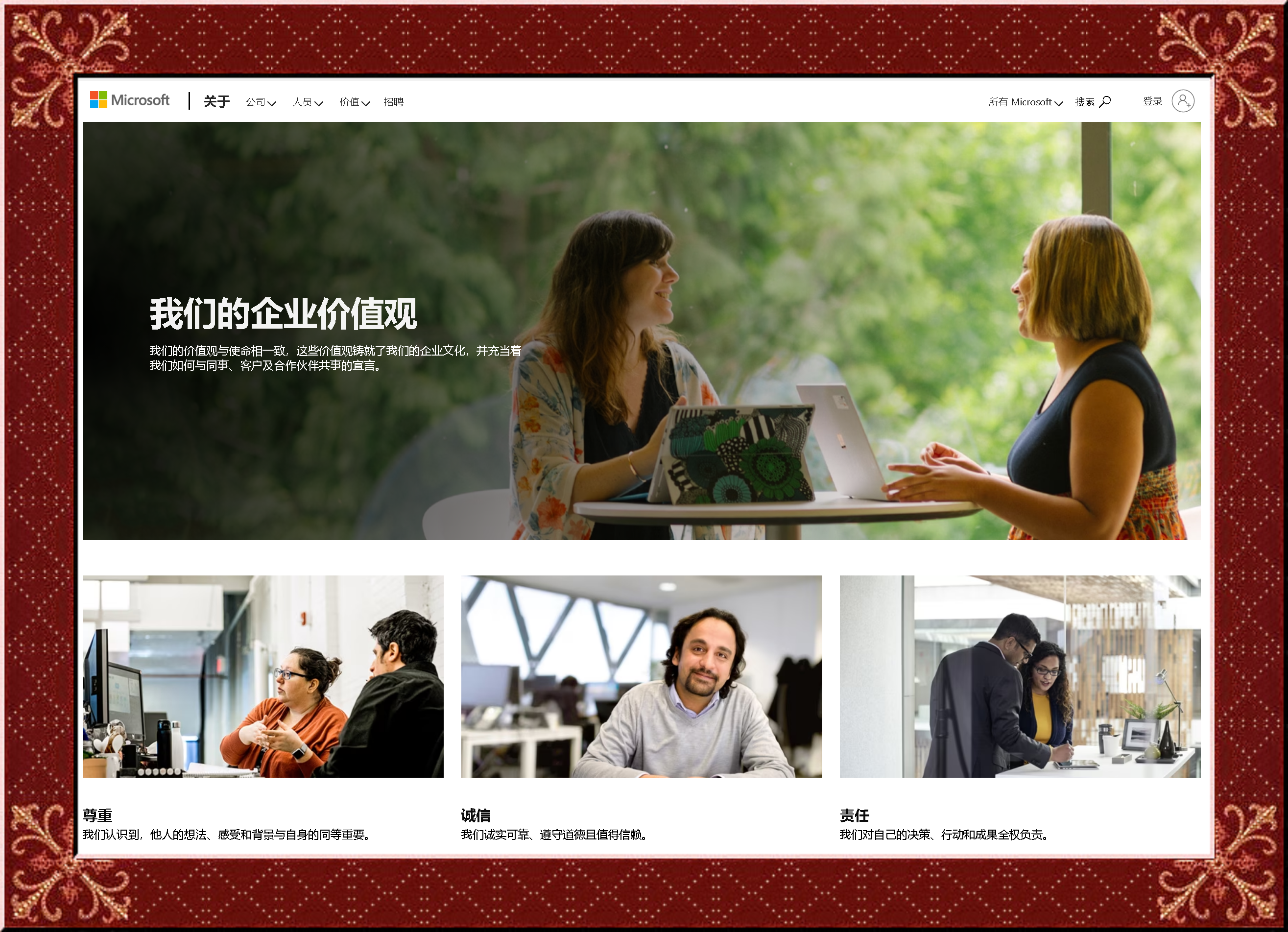 祝福偉大的微軟:我們的價(jià)值觀與使命相一致,這些價(jià)值觀鑄就了我們的企業(yè)文化,并充當(dāng)著我們?nèi)绾闻c同事、客戶及合作伙伴共事的宣言!