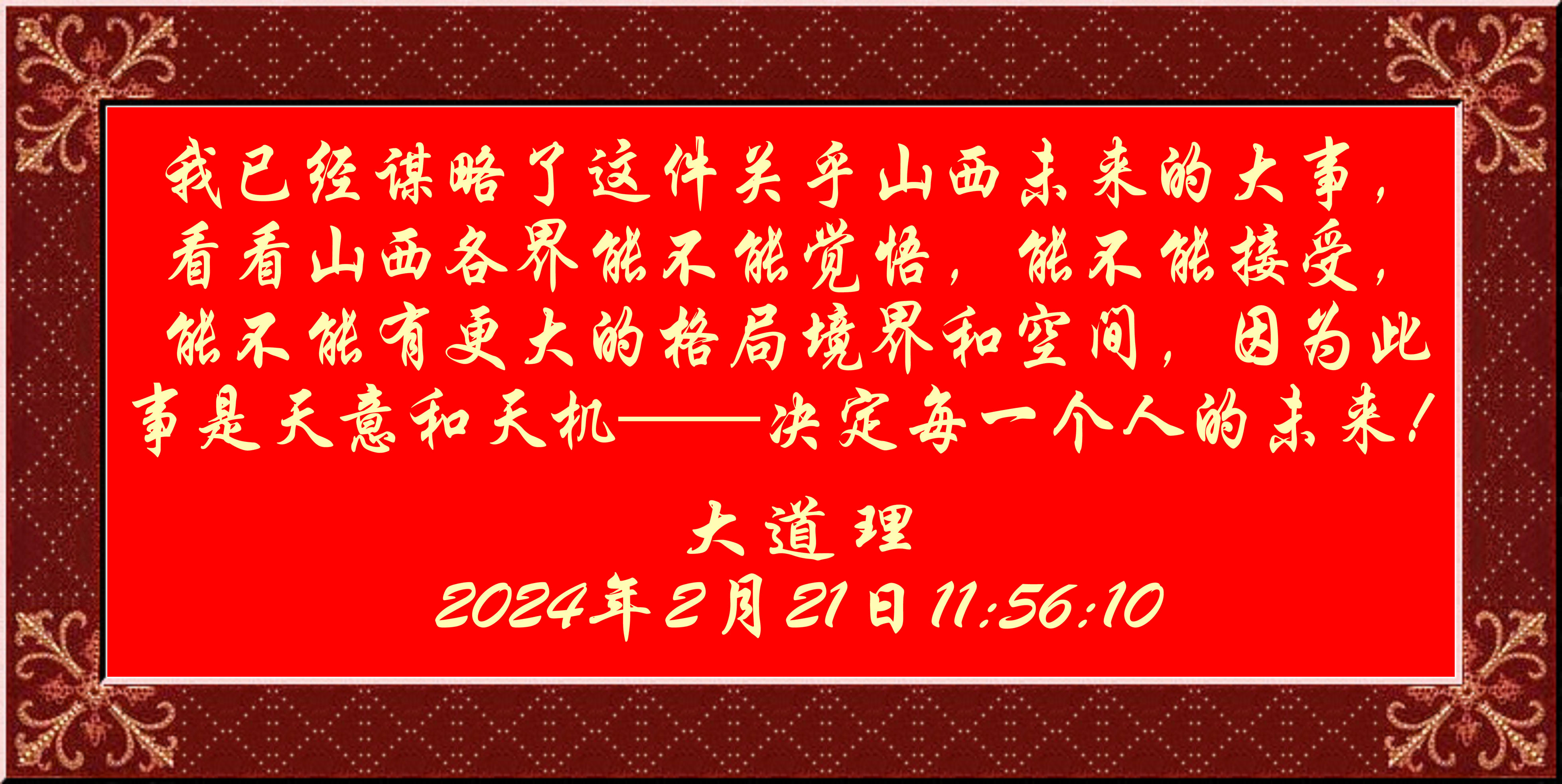 我已經謀略了這件關乎山西未來的大事,看看山西各界能不能覺悟,能不能接受,能不能有更大的格局境界和空間,因為此事是天意和天機——決定每一個人的未來!