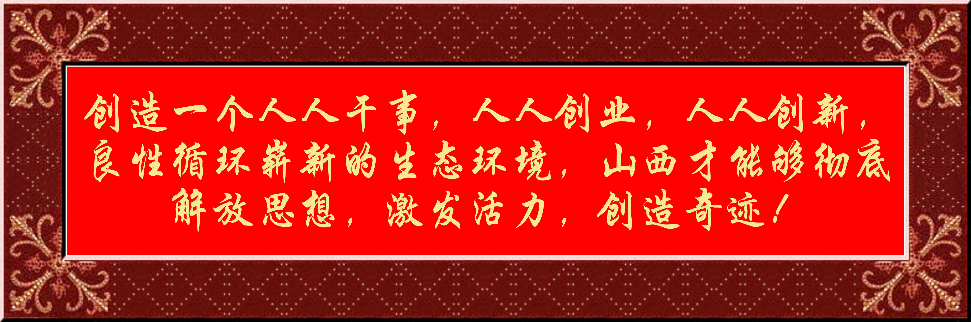 山西需要發展,需要大發展,需要以更大的膽識和魄力面對自身的差距和不足,那就是敢于革自己的命,把那些不適應新時代發展的條條框框徹底打破,把那些只為名而不為民的庸官徹底清除,創造一個人人干事,人人創業,人人創新,良性循環嶄新的生態環境,山西才能夠徹底解放思想,激發活力,創造奇跡!