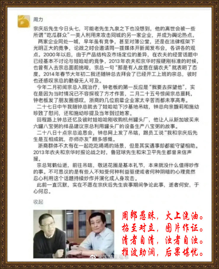 同行是冤家,一山難容二虎,這兩句老話人人皆知卻又人人不懂,其中的根源還是一個利益的糾葛和矛盾, 鐘睒睒顯然不具備大智慧的格局和境界!而他的同僚意氣用事更把事情復(fù)雜化,直接加劇了矛盾進一步激化,形成了一種文化和理念上的沖突在所難免!因為已經(jīng)上升到社會現(xiàn)象的局面,任何一方都無法控制和左右事態(tài)發(fā)展的節(jié)奏和后果了!